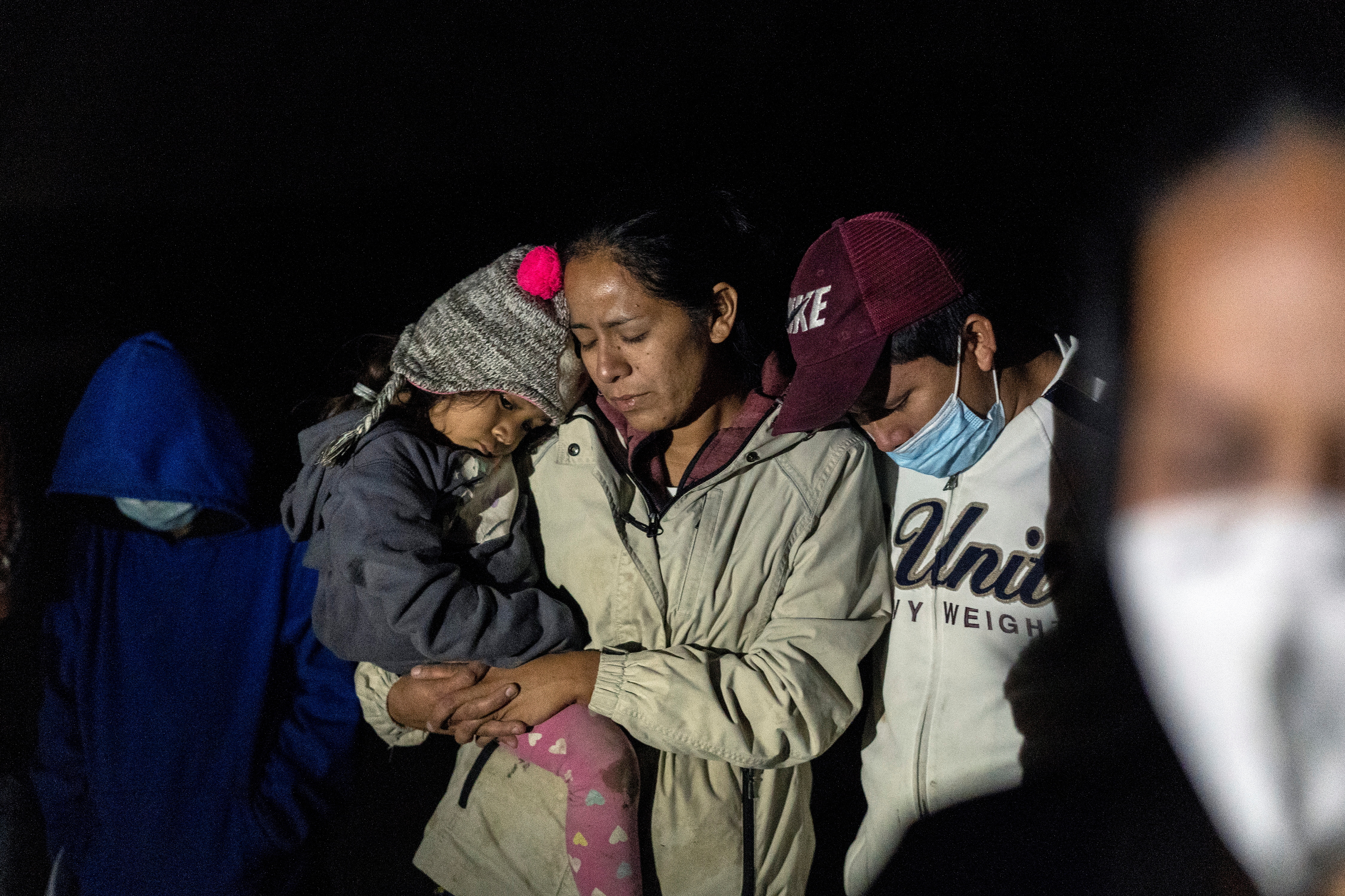 Migrant families pray after crossing the Rio Grande into the United States from Mexico, in Roma, Texas, on April 20 [Go Nakamura/Reuters]