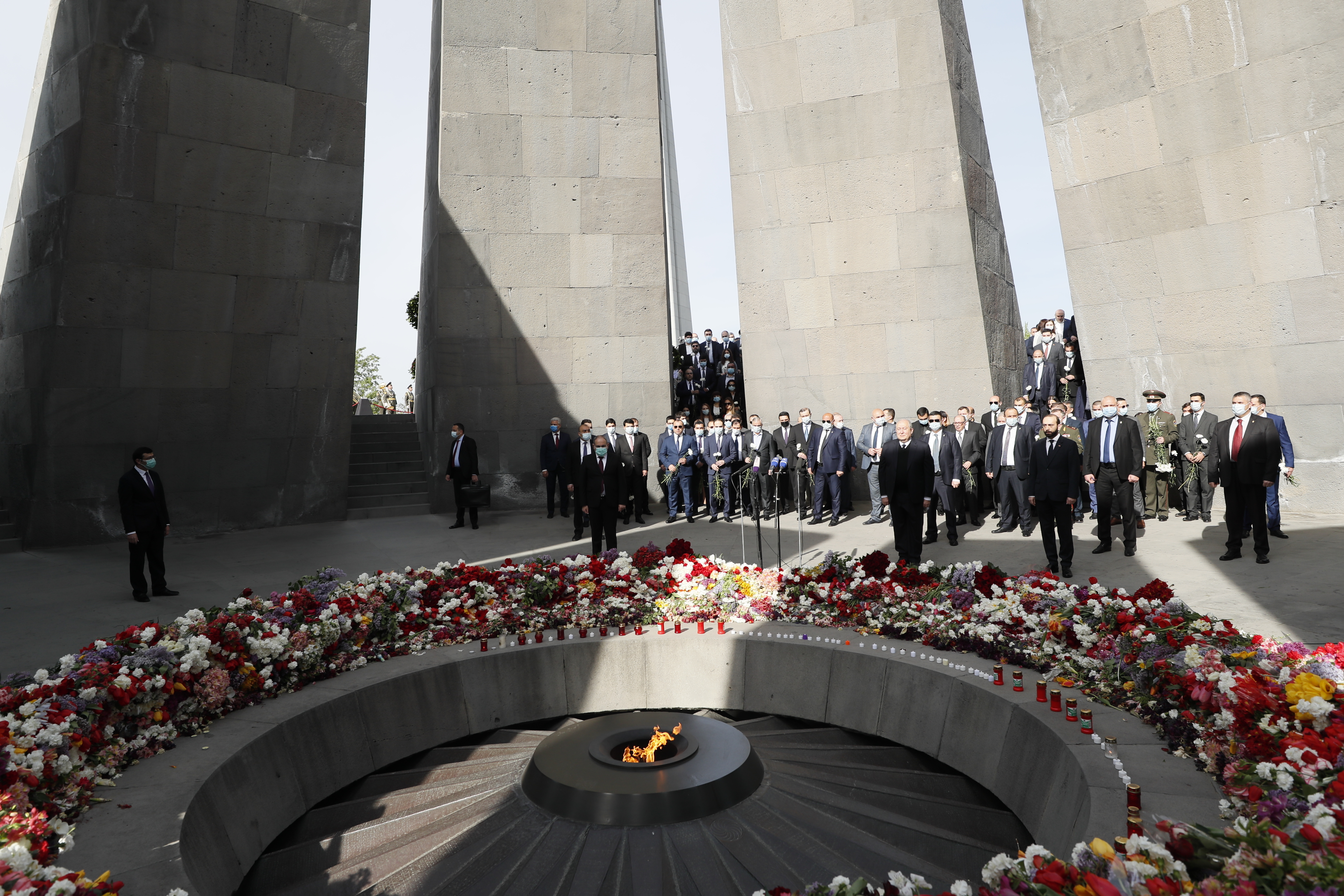 Armenian Prime Minister Nikol Pashinyan, centre, attends a memorial service at the monument to the victims of mass killing of Armenians in the Ottoman Empire during World War I [Tigran Mehrabyan/PAN Photo via AP]