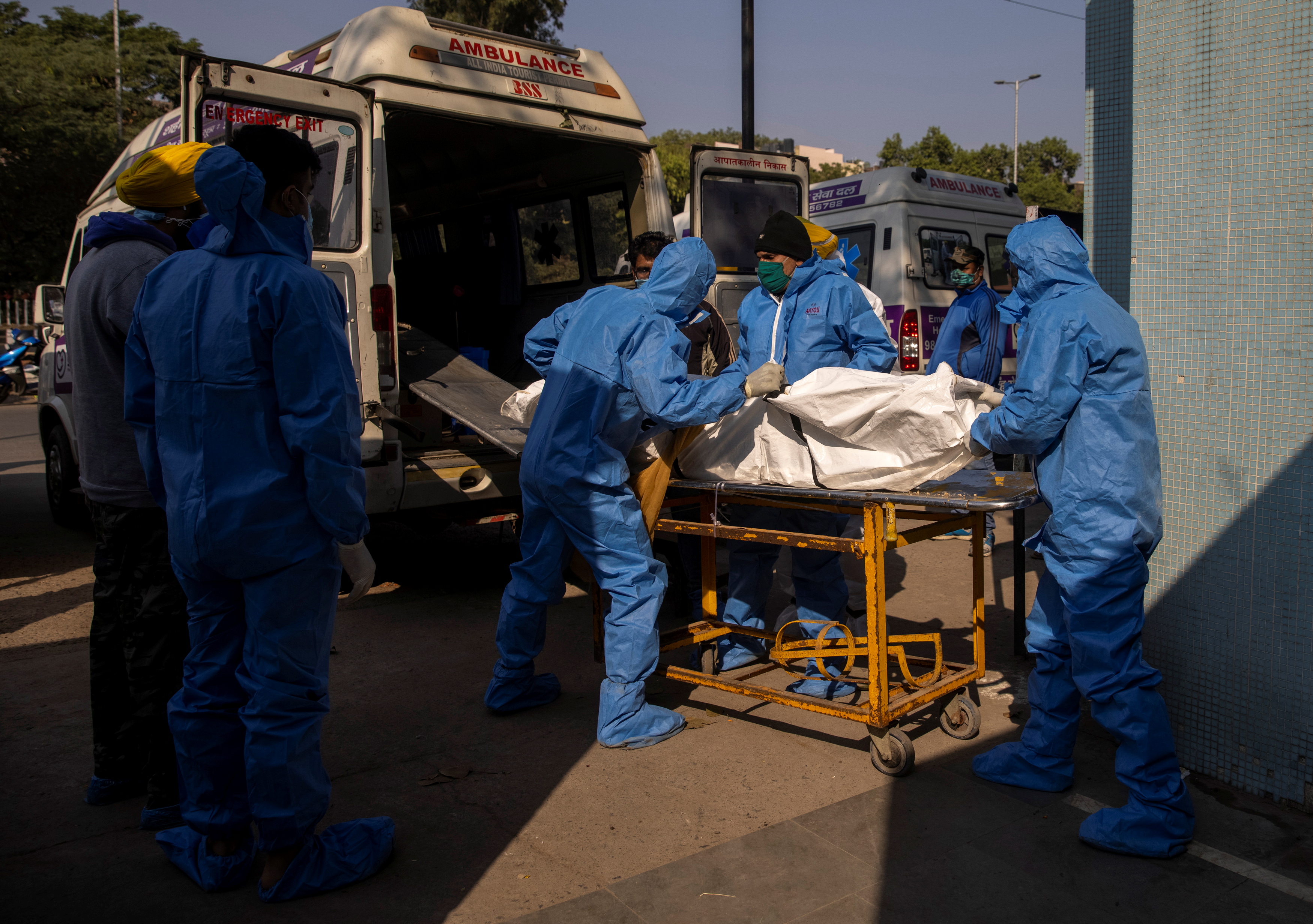 In the capital, New Delhi, ambulances lined up for hours to take COVID-19 victims to makeshift crematorium facilities in parks and parking lots, where bodies burned on rows of funeral pyres.