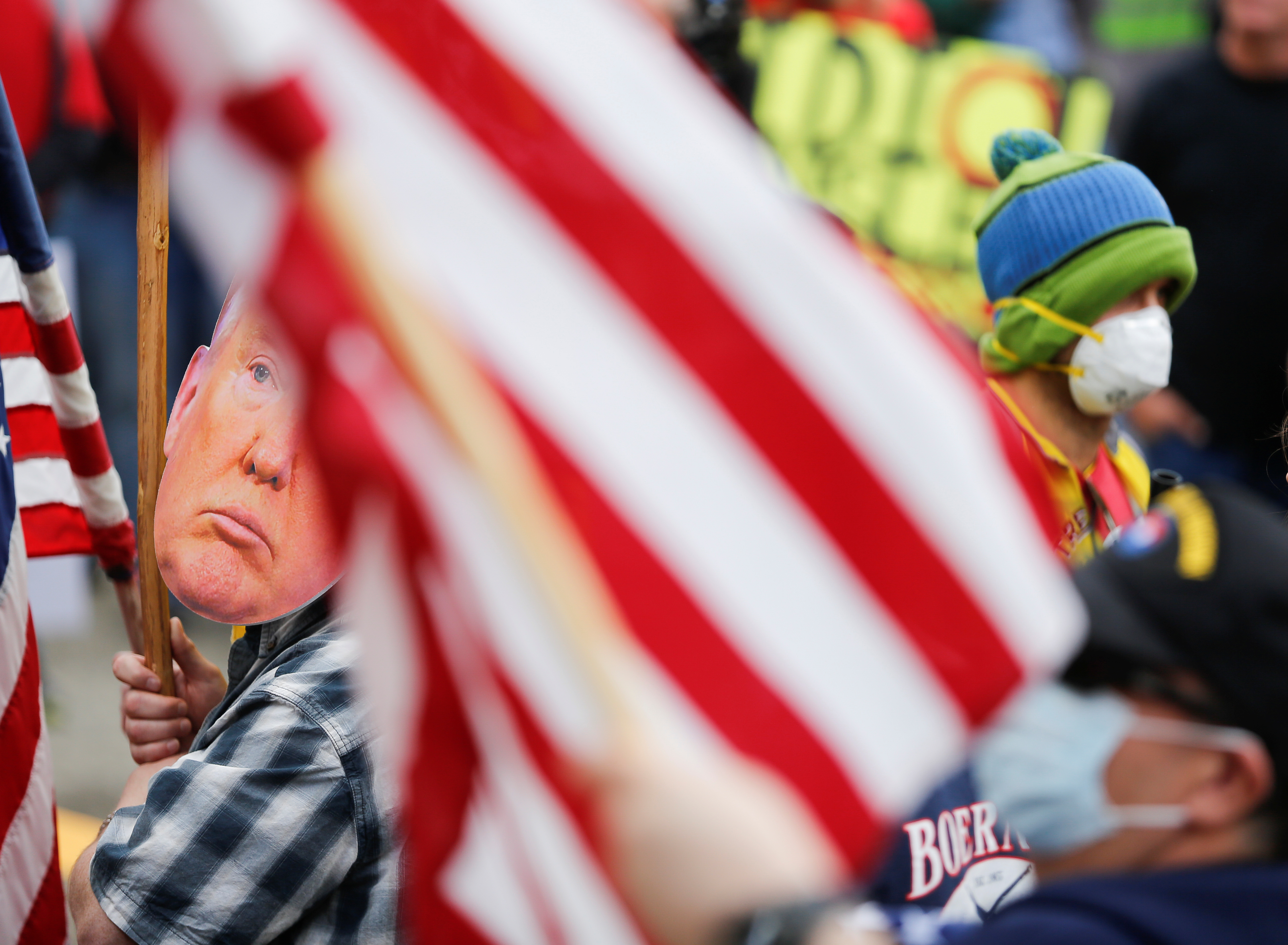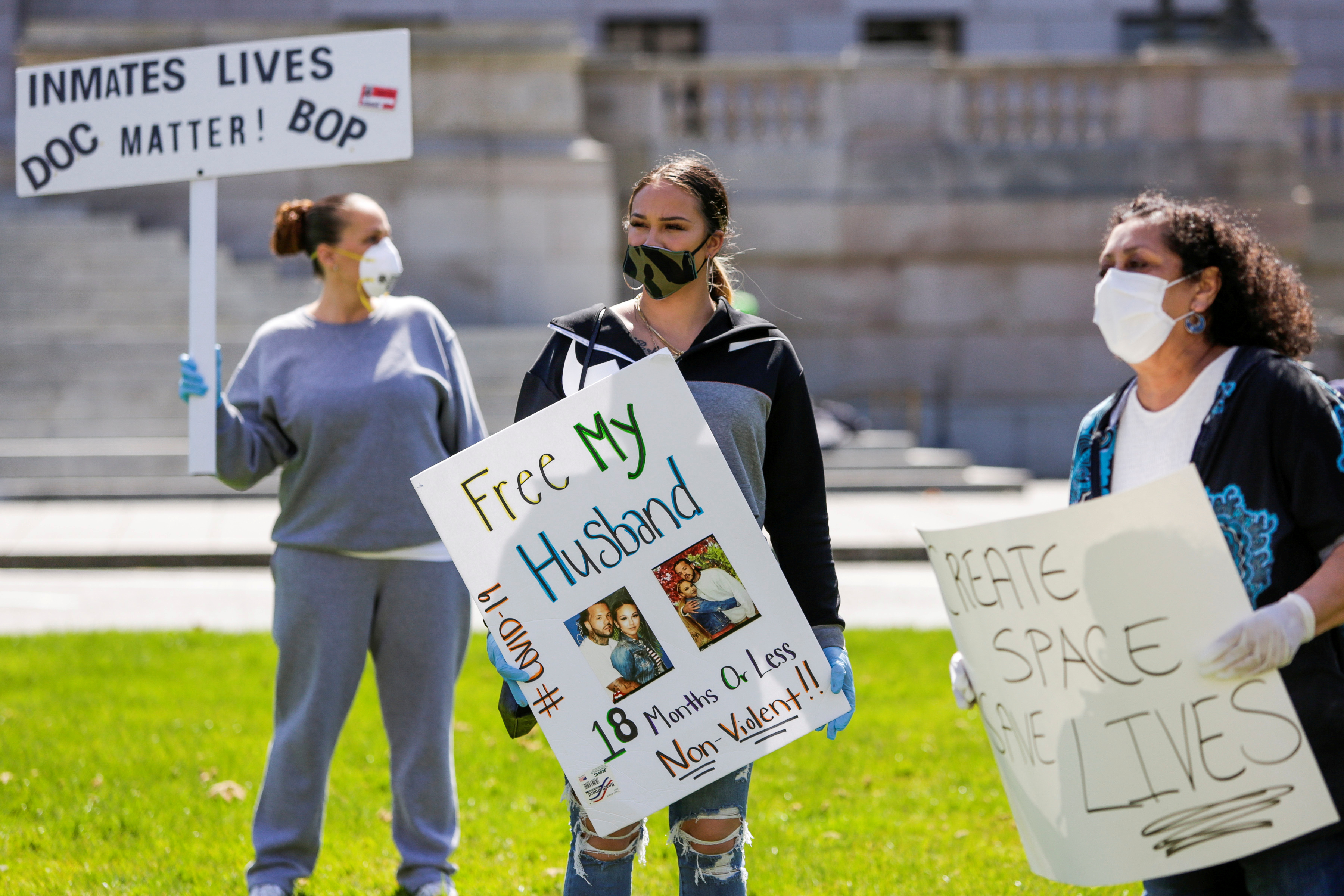 Family and people concerned about the safety and health of prison inmates during the COVID-19 outbreak protest outside the Washington state capitol as efforts continue to slow the spread of the coronavirus, on April 11, 2020 [File: Jason Redmond/Reuters]