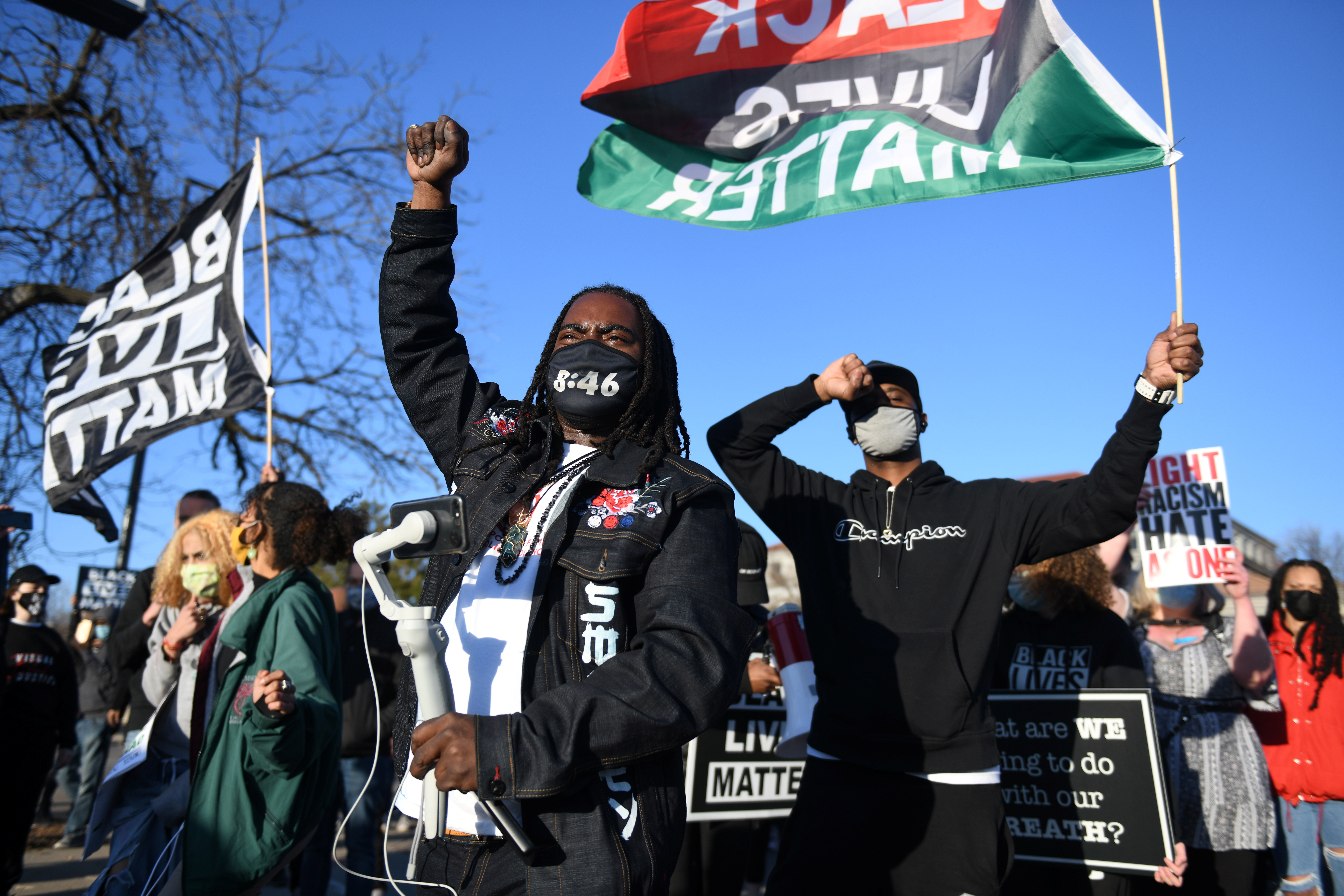 Black Lives Matter demonstrators march in St Paul, Minnesota, the US on March 19, 2021 [Nicholas Pfosi/Reuters]