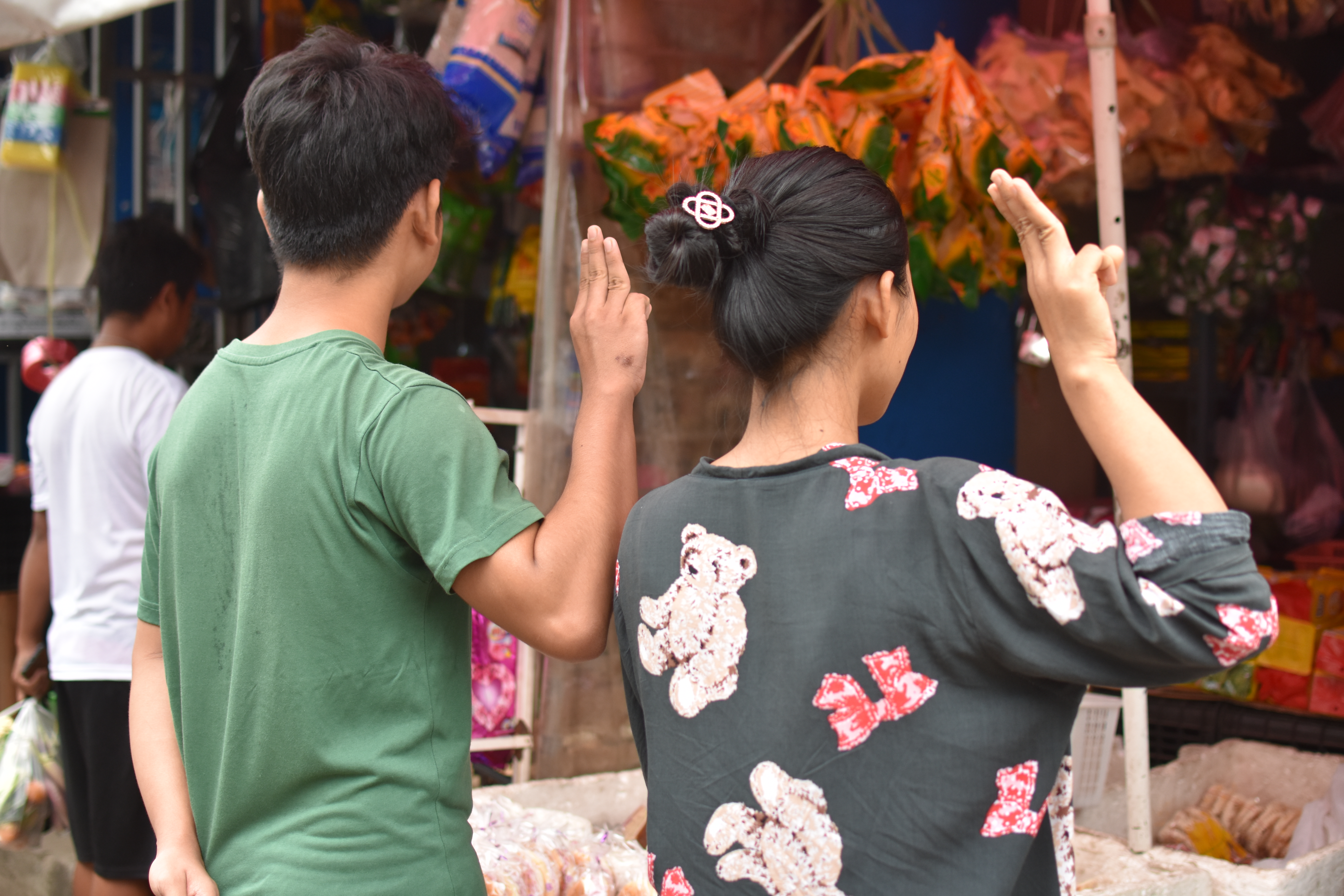 A young man and woman working at a shop in the market stepped out onto the street holding up the three-finger salute. They have asked to remain anonymous to protect their safety.