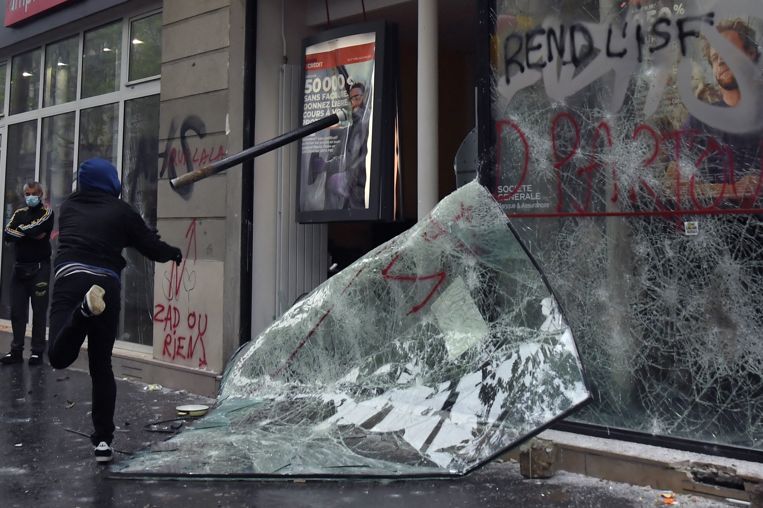 A protester throws a pole at a damaged bank in Paris [Bertrand Guay/AFP]