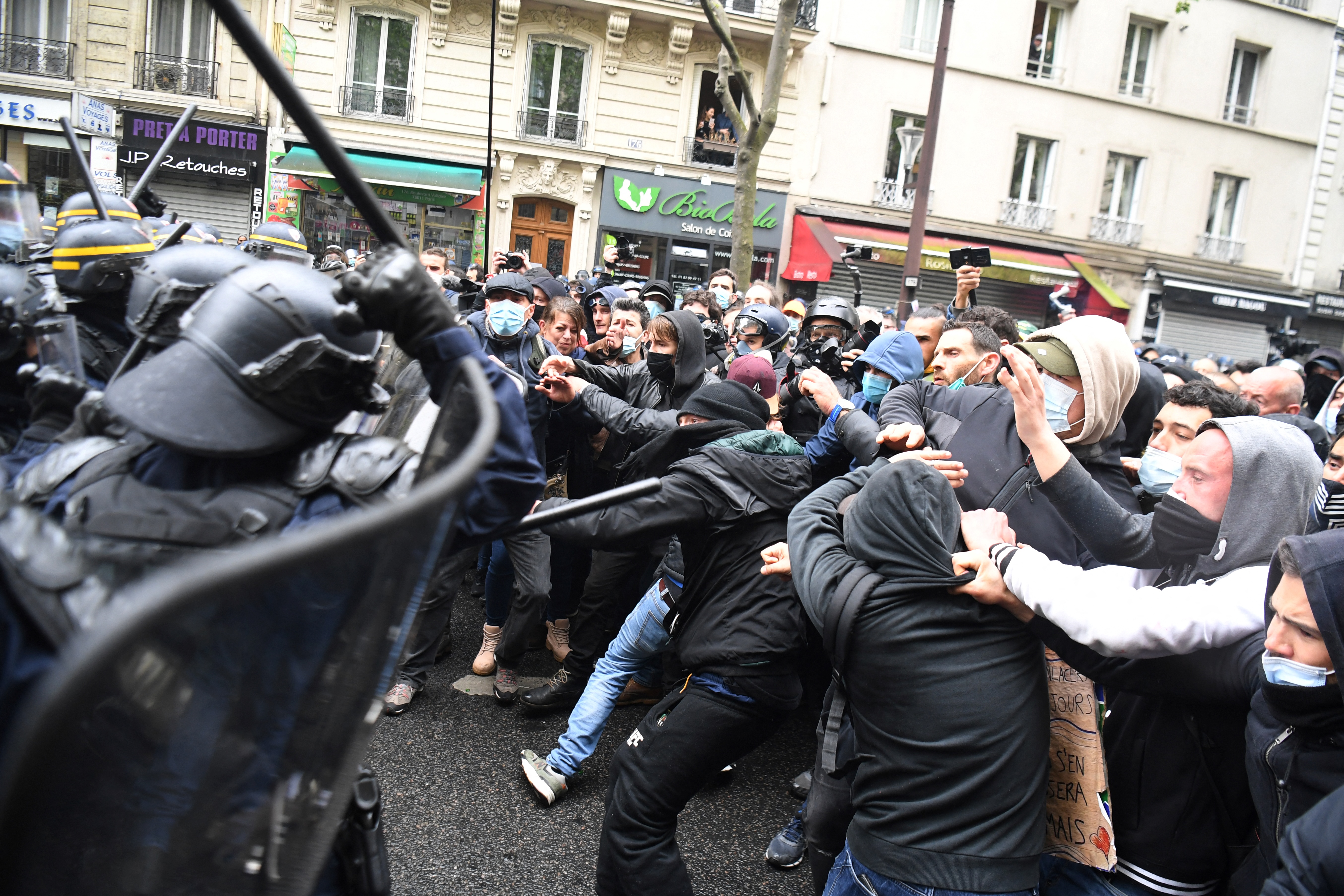 Protesters clash with police during the annual May Day rally in Paris [Alain Jocard/AFP]