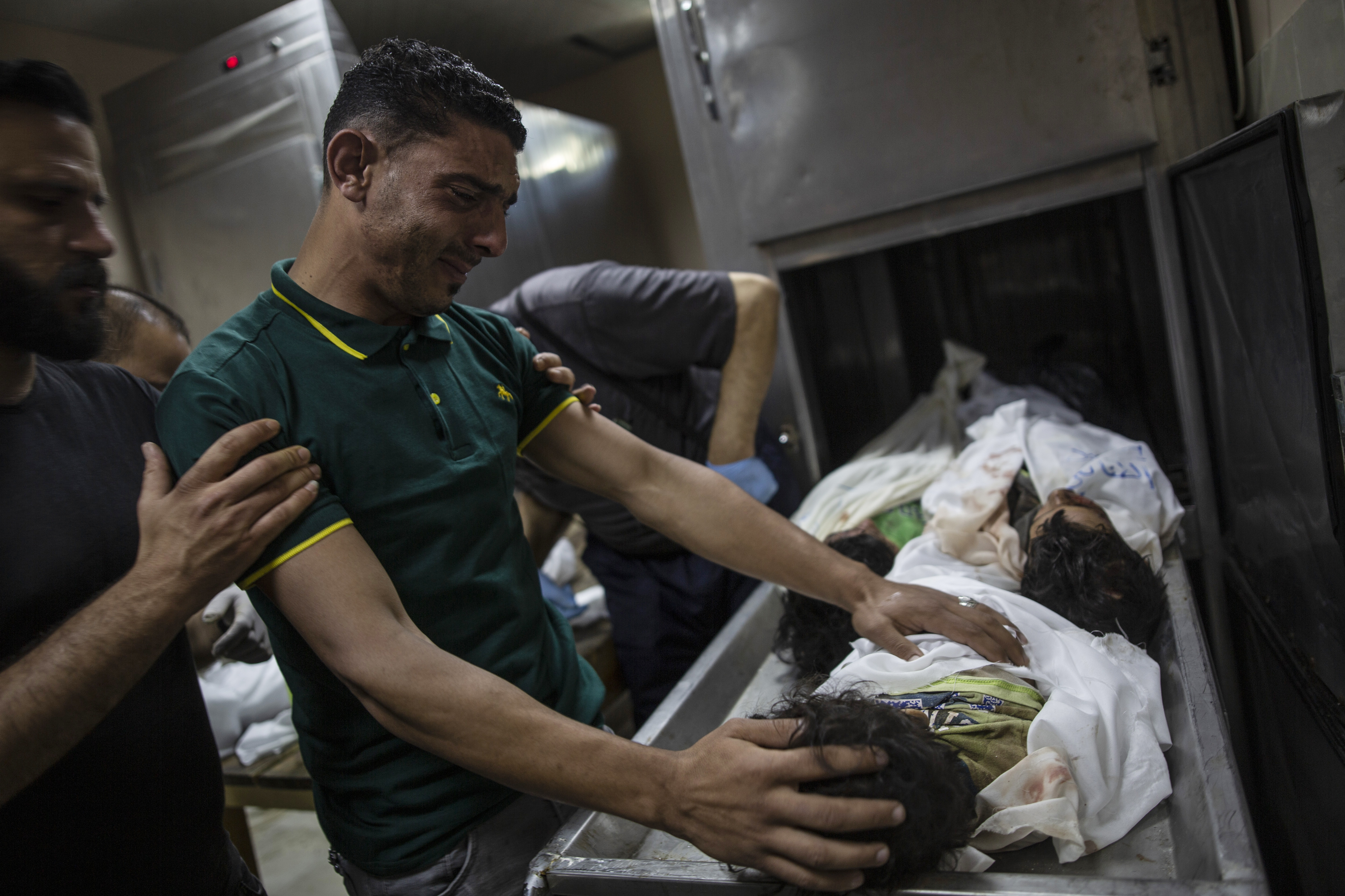 Hasan al-Attar stood quietly inside the morgue, staring at the bodies of his daughter, Lamya, and three other children belonging to the same family. Wearing his fireman’s vest, he bent over to kiss his daughter, before the refrigeration unit door was closed.