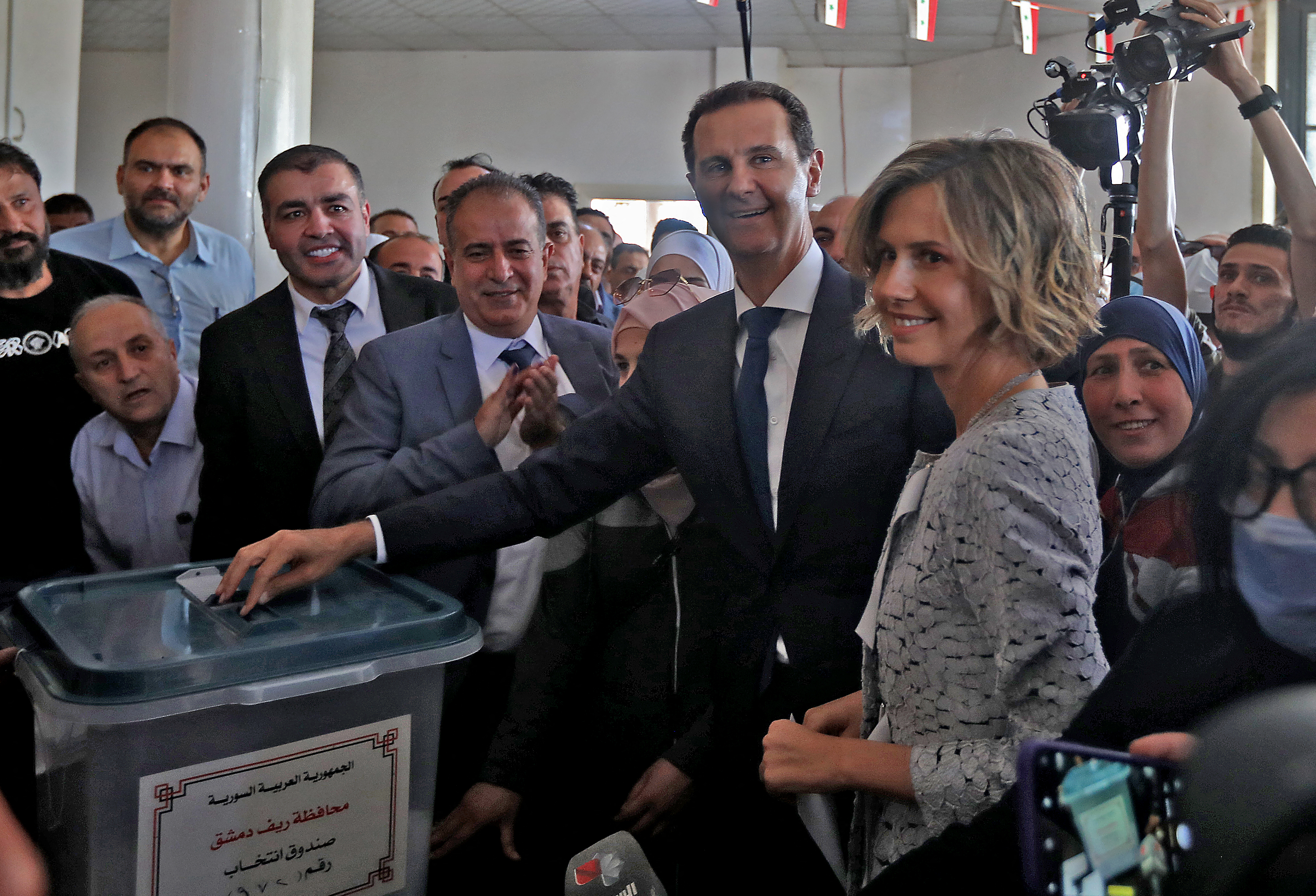 Banners of al-Assad were hung on the 12,000 polling stations across the country, while crowds of people sang and danced outside. State and pro-government media portrayed the elections as one of unity across sectarian, ethnic, and ideological lines.