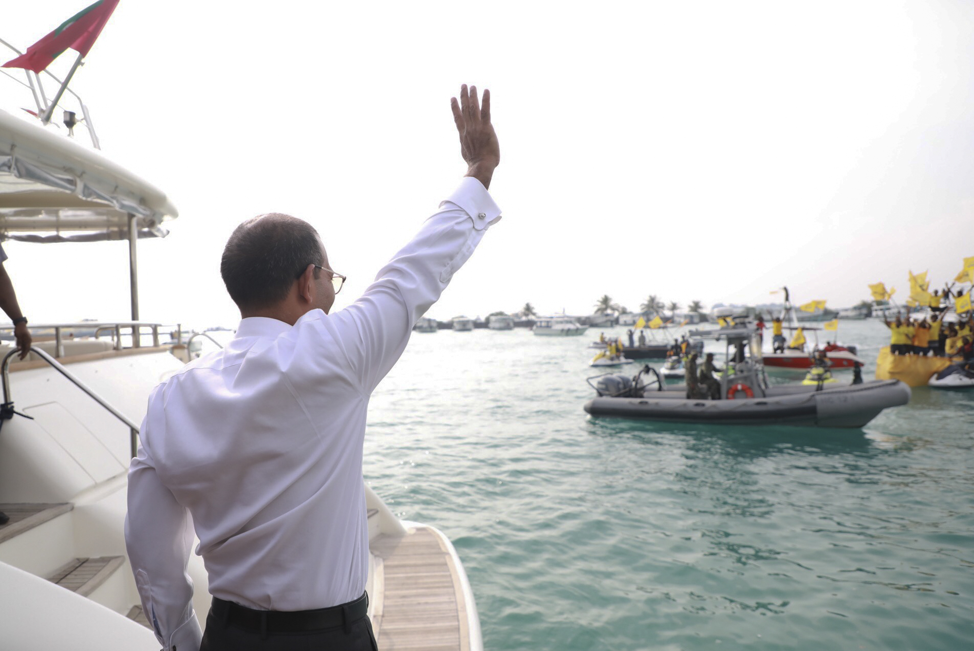 Nasheed waves to supporters following his return to the Maldives after more than two years in exile [File: Mohamed Sharuhaan/AP Photo]
