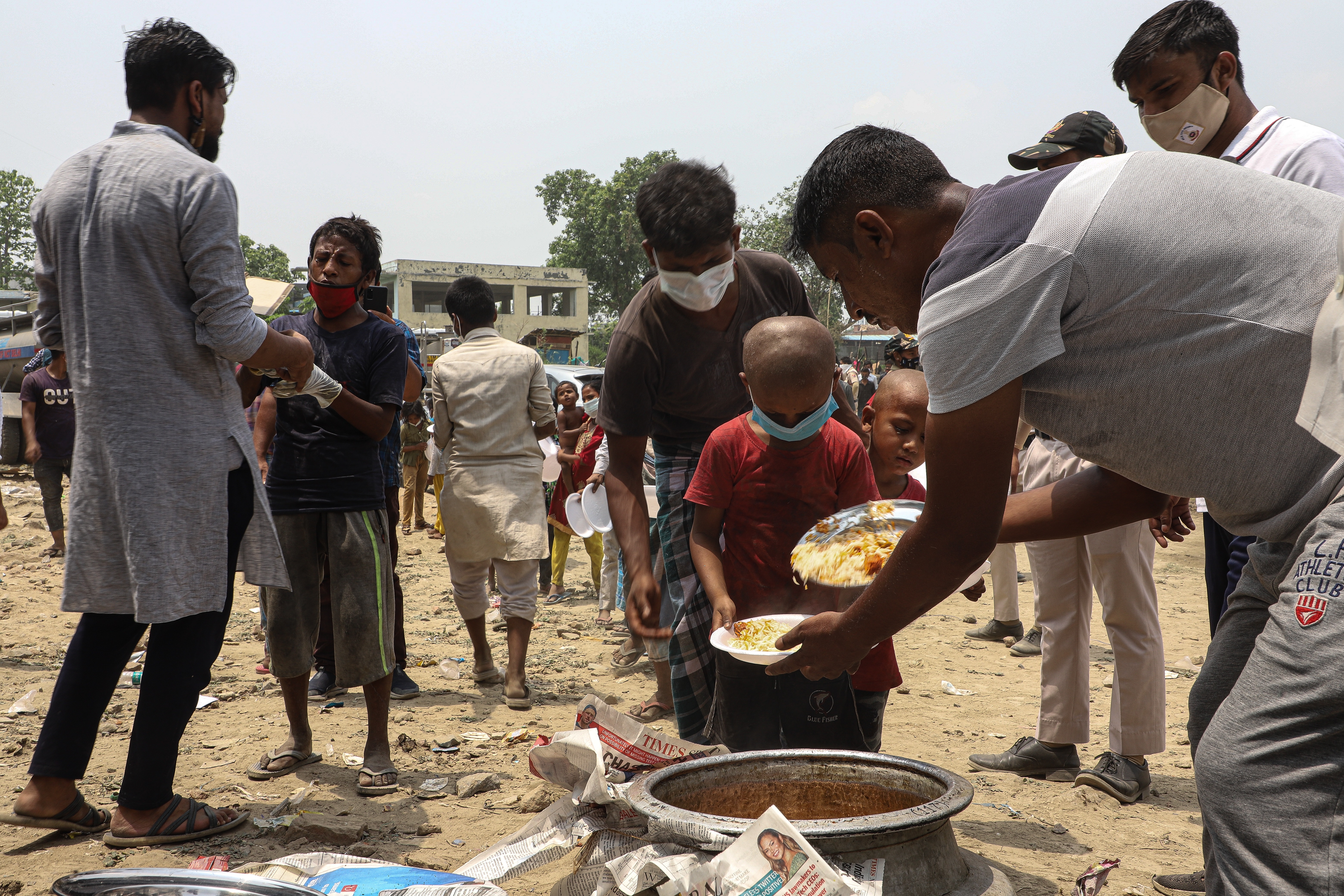 Volunteers provide food to refugees after fire destroyed a Rohingya Camp in New Delhi [Meer Faisal/Al Jazeera]