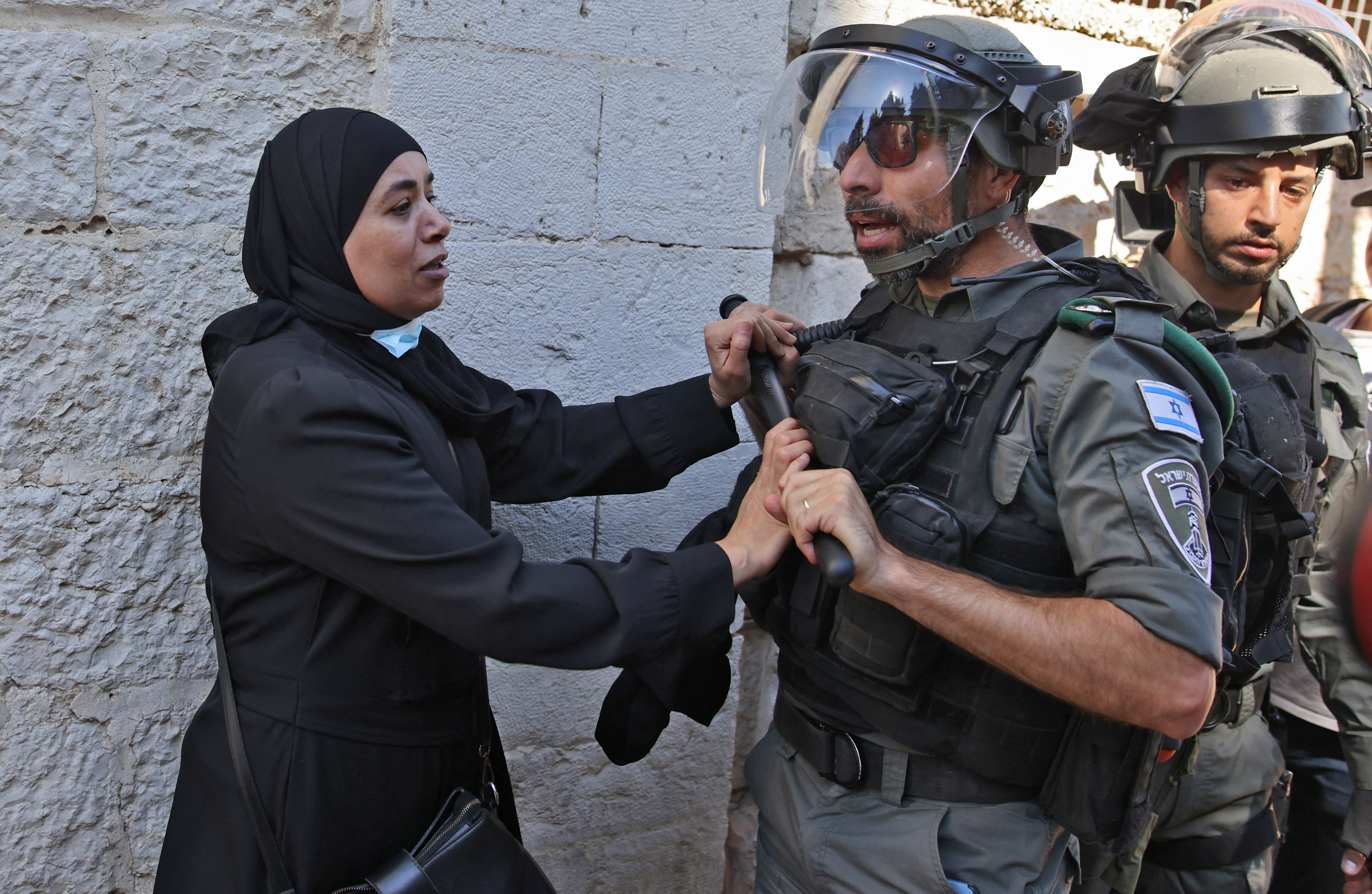 In the first incident, a Palestinian woman near the Damascus Gate area raised the flag for a few seconds before Israeli forces grabbed it and pushed the woman back from the area.