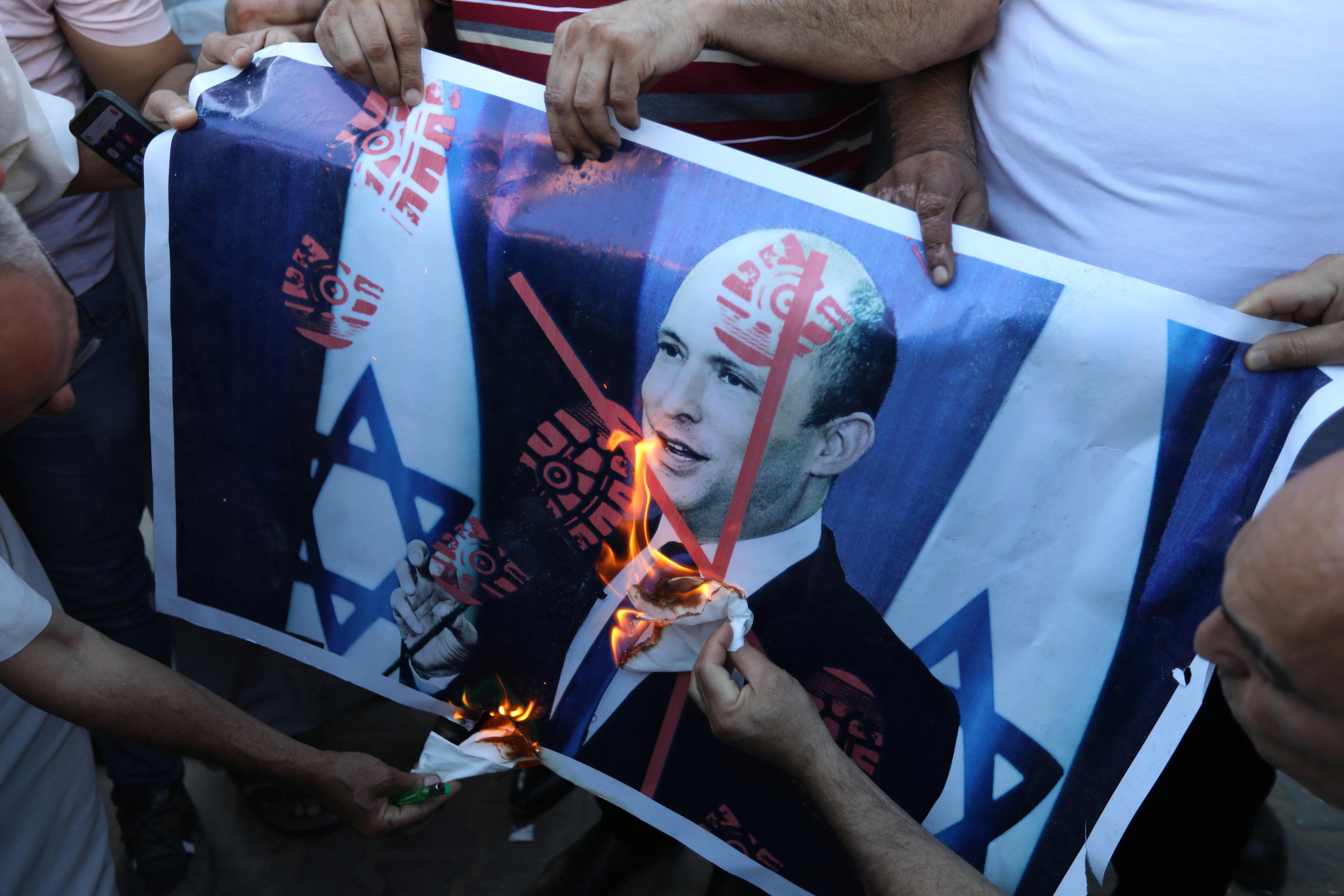 Some protesters burned pictures of former Israeli Prime Minister Benjamin Netanyahu and Naftali Bennett, the current prime minister.