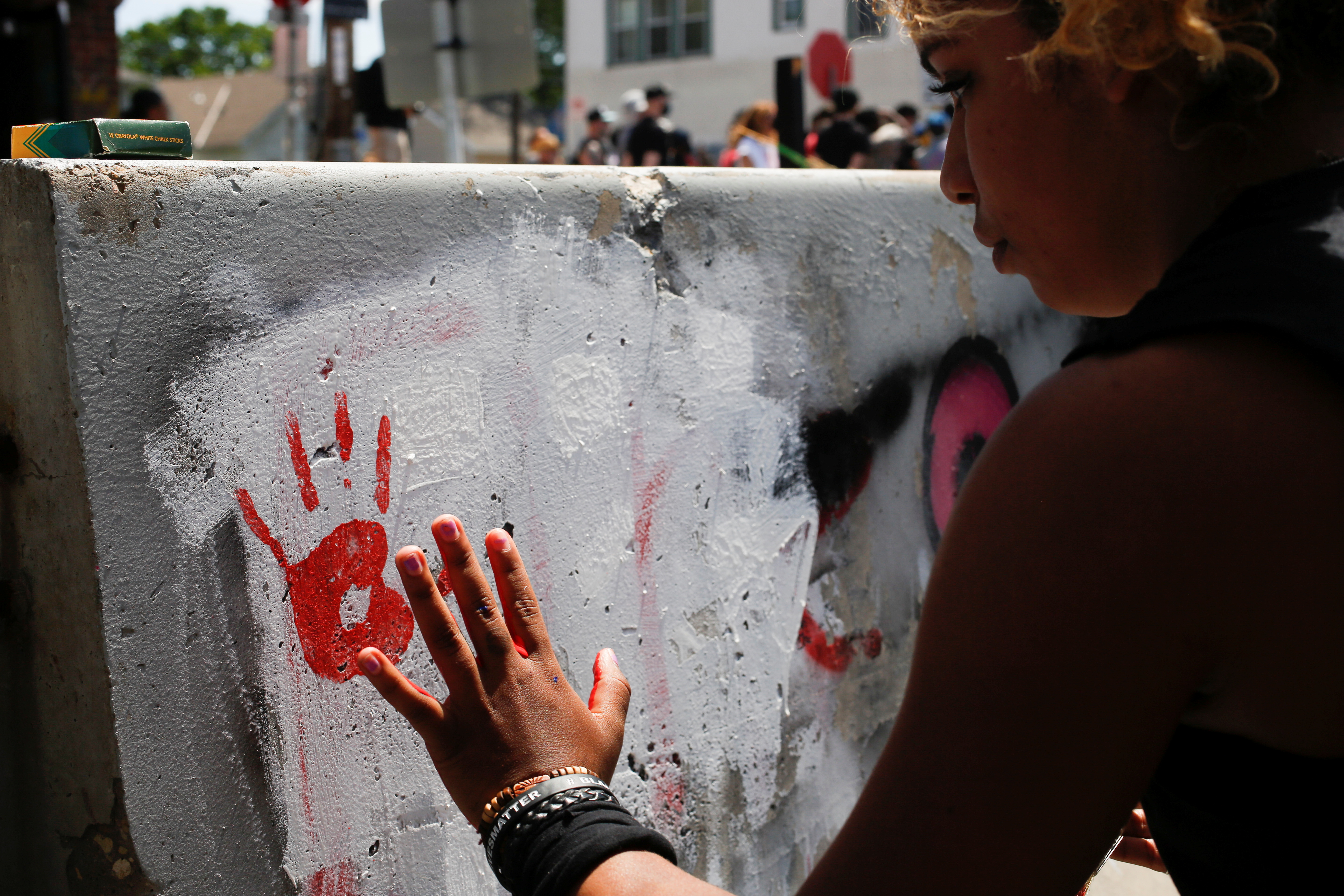 Activists quickly replaced them with makeshift barriers. They have put out calls for people to come to the intersection with art supplies.