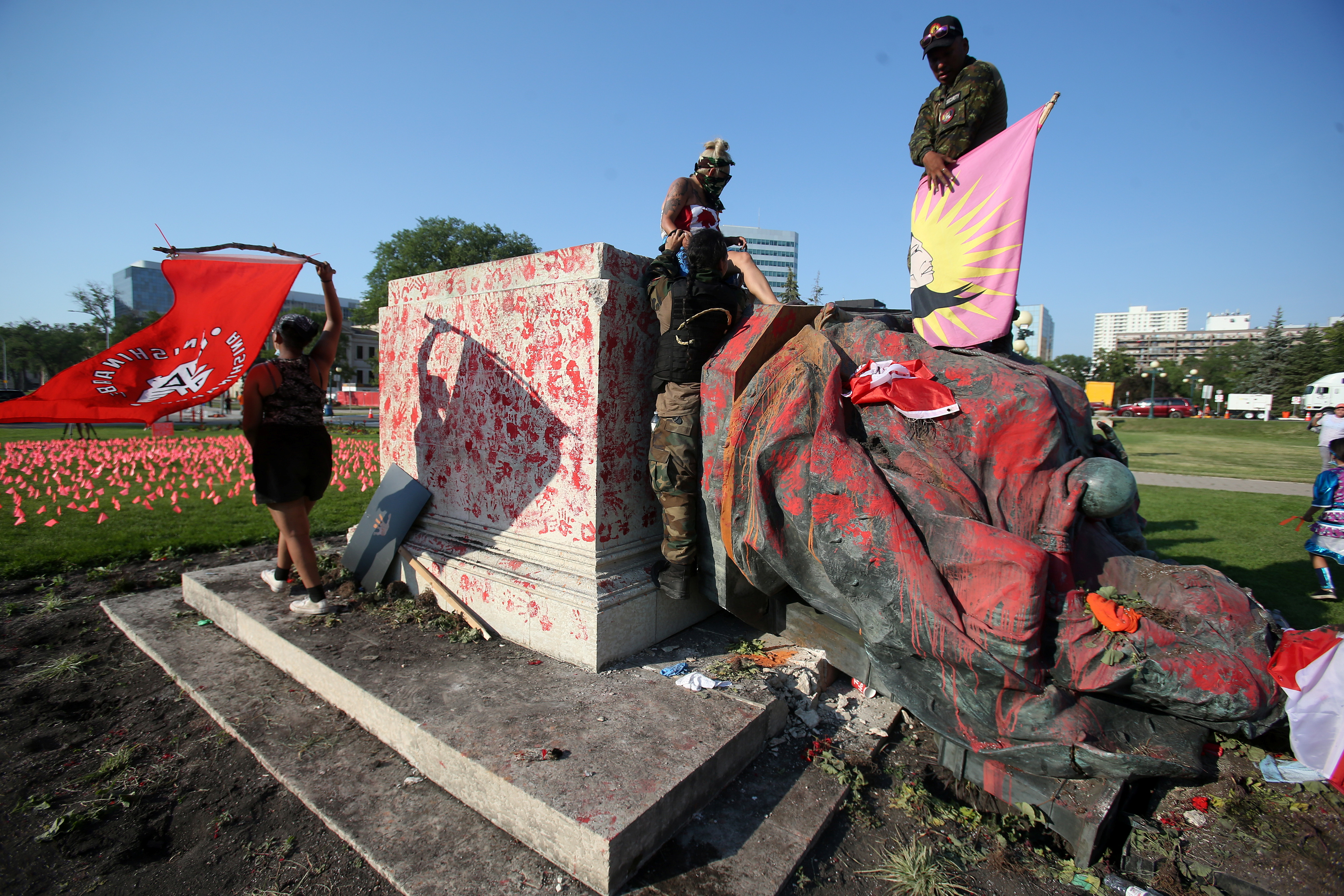 In Winnipeg, a crowd cheered as Queen Victoria’s statue fell outside the Manitoba provincial legislature. Protesters, many of whom wore orange clothing, also kicked the toppled statue and danced around it. The pedestal and statue were daubed in red paint hand marks.