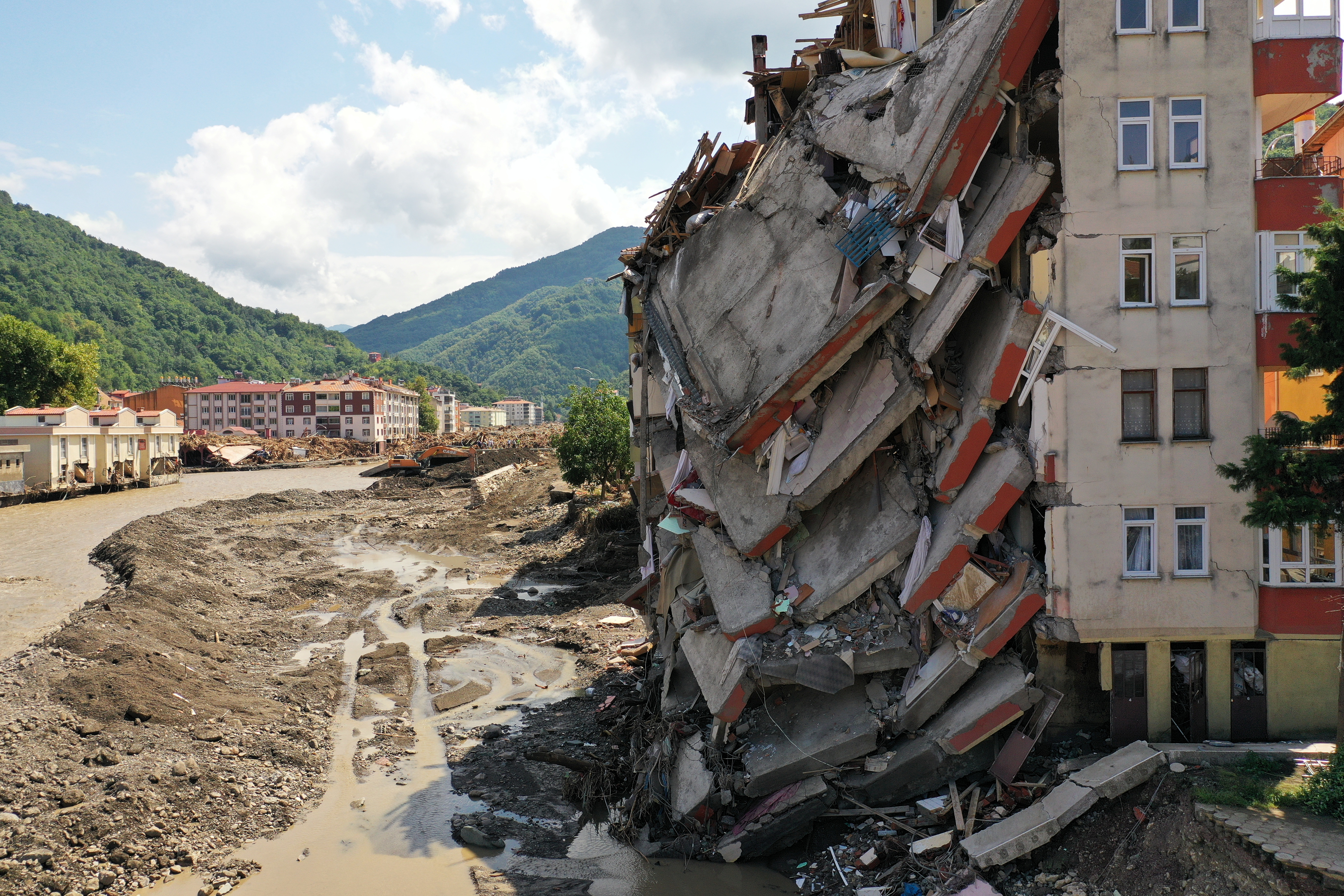 In Sinop, floodwaters almost completely wiped out the village of Babacay, leaving toppled homes, damaged bridges and rubble in their wake. A five-story apartment building constructed on a riverbed was destroyed.