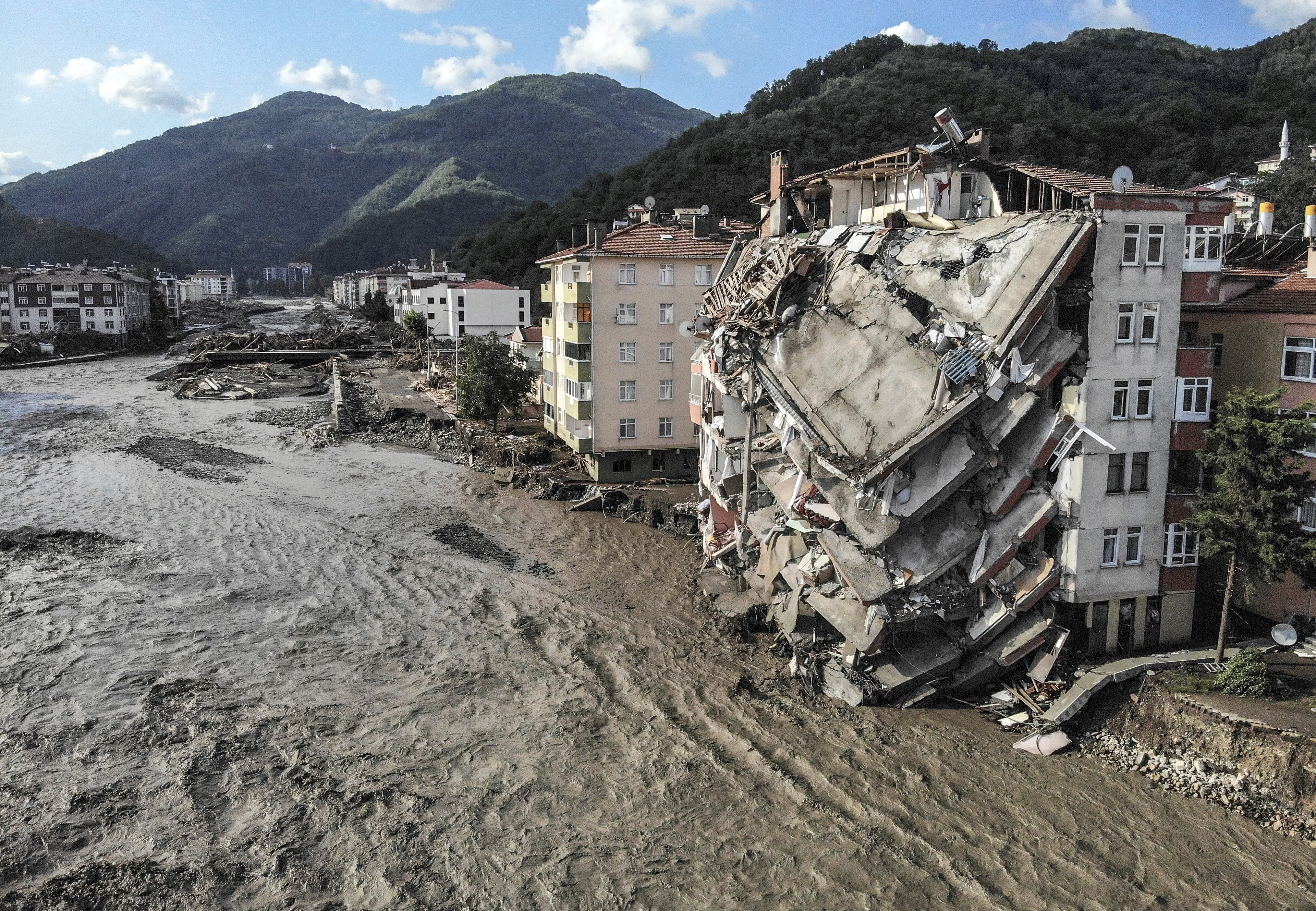 Drone footage showed massive damage in the town of Bozkurt in Kastamonu province, where rescue teams searched demolished buildings.