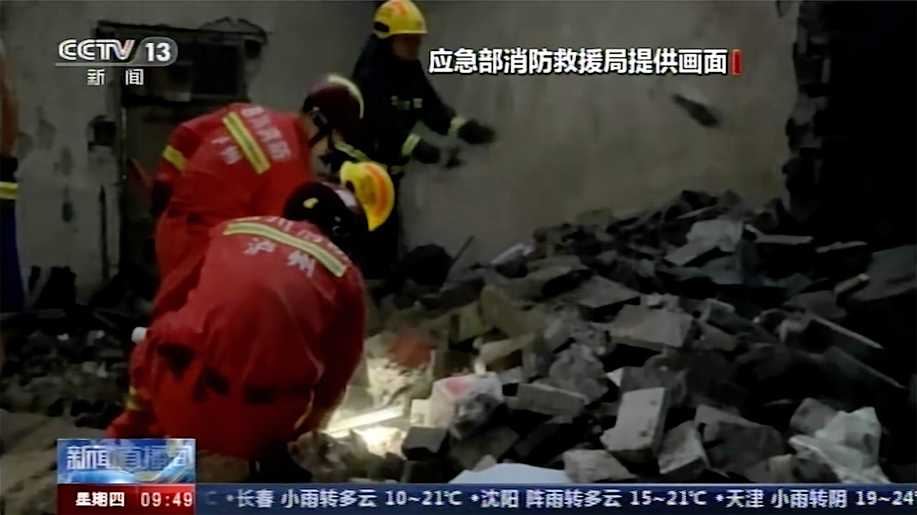 Live footage from Luxian by state broadcaster CCTV showed workers climbing up ladders in pouring rain to remove hazardous debris hanging off buildings, including half-broken panes of glass.