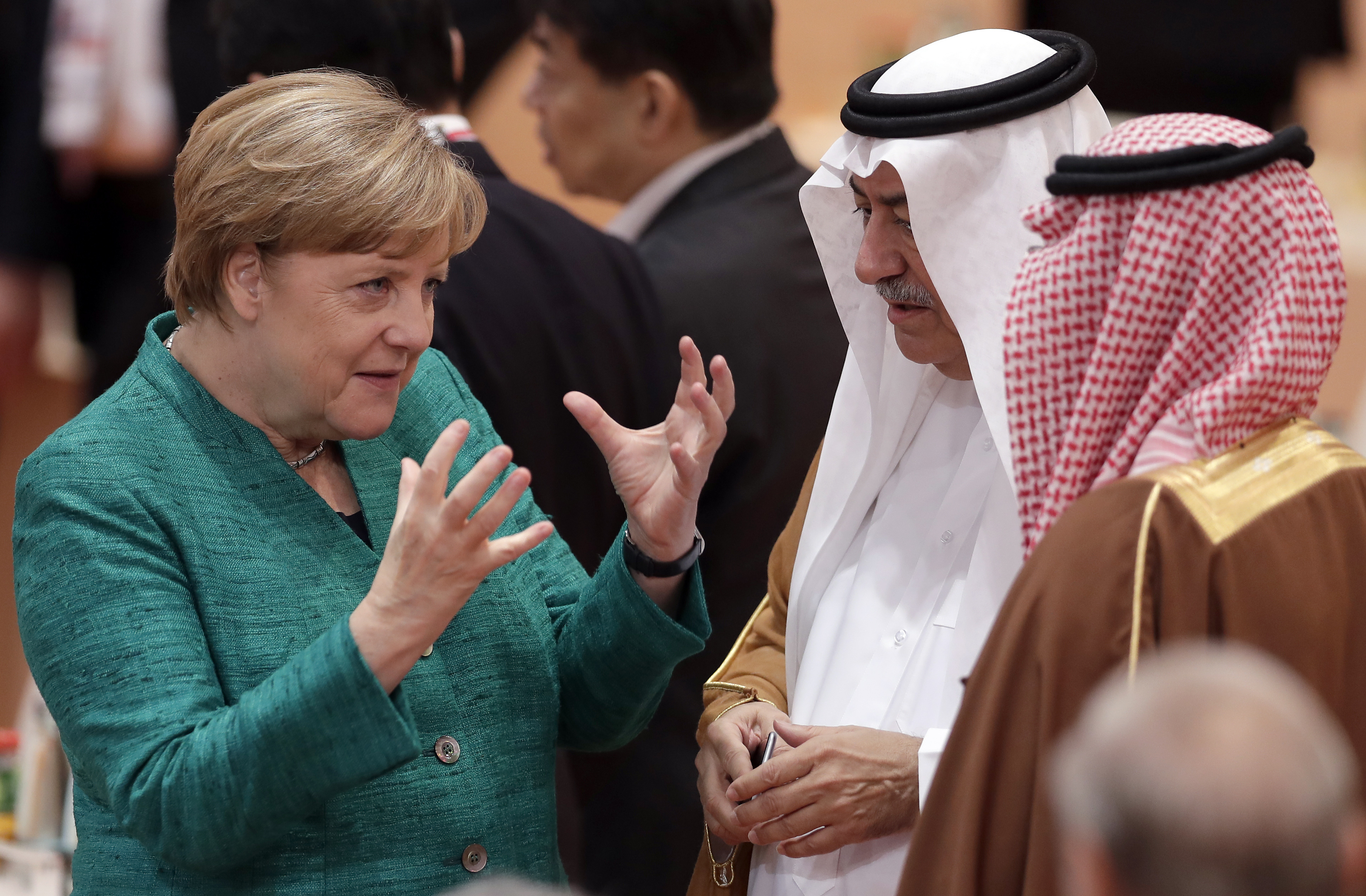 German Chancellor Angela Merkel, left, talks to Saudi Arabia's State Minister Ibrahim al-Assaf, prior to a working session at the G-20 summit in Hamburg, northern Germany, Saturday, July 8, 2017 [Michael Sohn/AP]