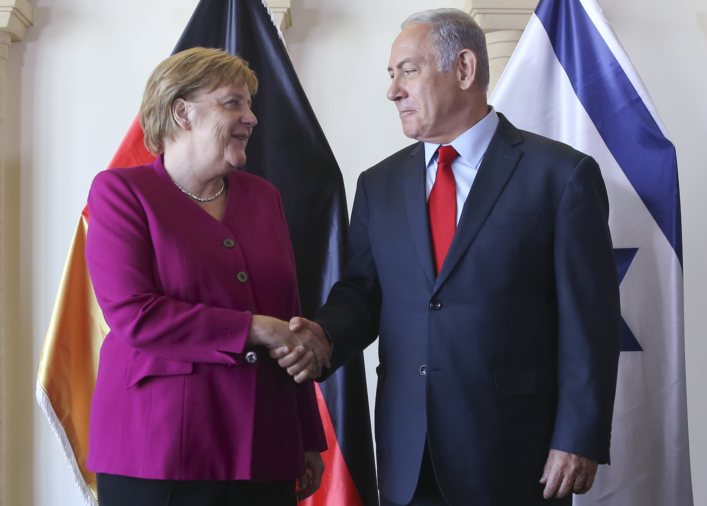 Israeli Prime Minister Benjamin Netanyahu and German Chancellor Angela Merkel pose photographers between meetings in Jerusalem, Thursday, October 4, 2018 [Oded Balilty/AP/Pool]