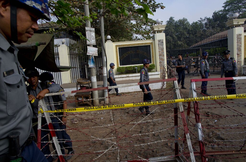 ![Police barricades outside Insein prison on the outskirts of Yangon, Myanmar, in 2015. Two explosions at the prison on Wednesday are reported to have killed at least eight people, according to media reports [File: Gemunu Amarasinghe/AP]](/wp-content/uploads/2022/10/AP154844638355.jpg?resize=770%2C513&quality=80)