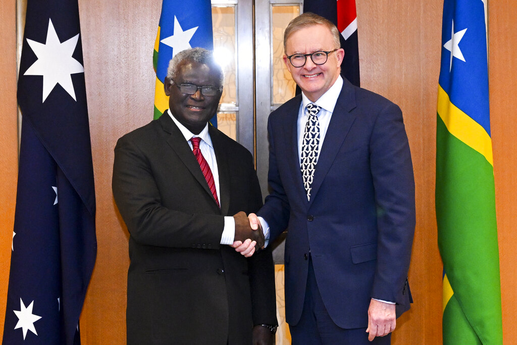 ![Australian Prime Minister Anthony Albanese (right) and Solomon Islands Prime Minister Manasseh Sogavare (left) shake hands ahead of a bilateral meeting at Parliament House in Canberra, Australia on October 6, 2022 [Lukas Coch/AAP via AP]](/wp-content/uploads/2022/10/AP22279249925108.jpg?resize=770%2C513&quality=80)