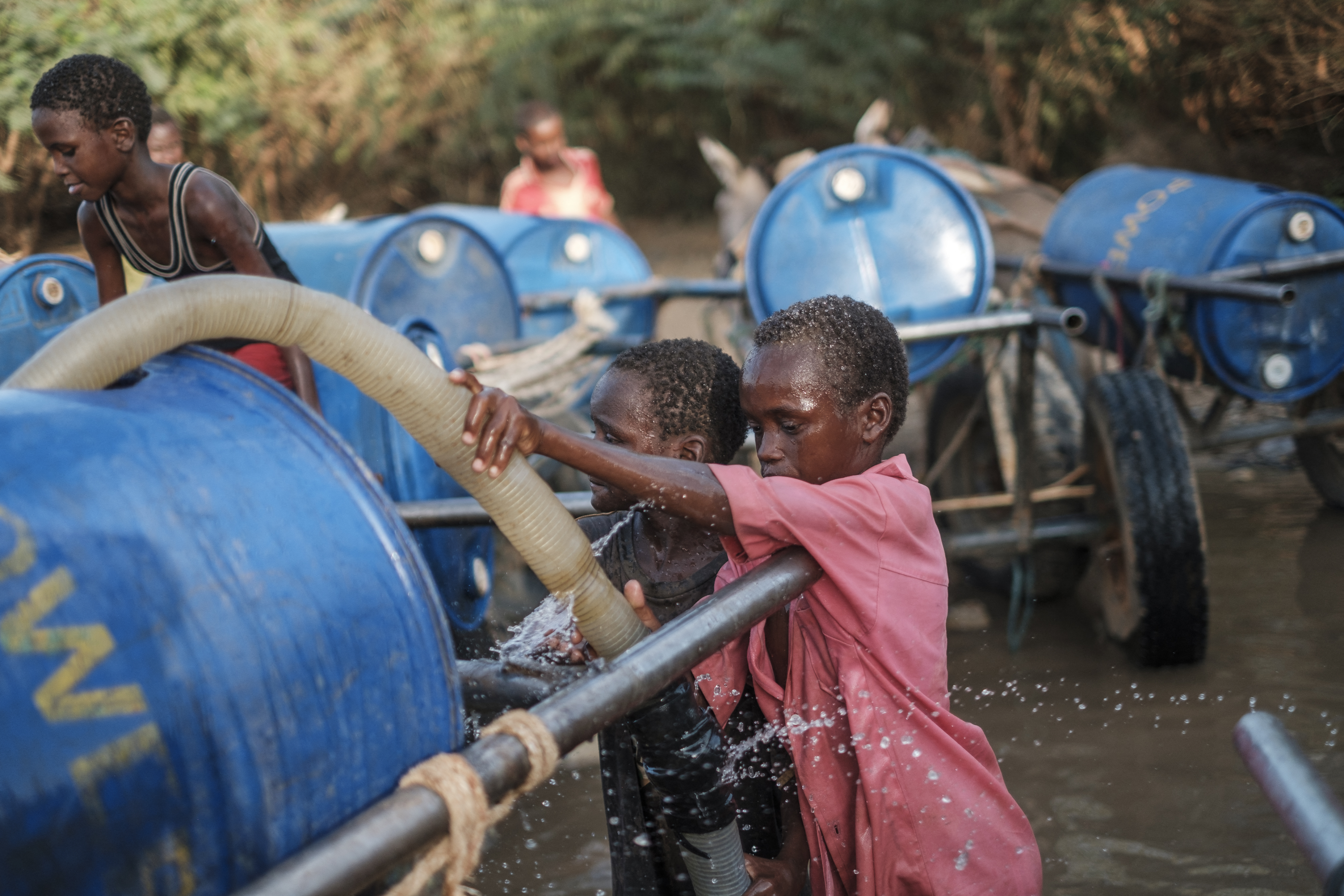 Children fill water tanks in a private pump near the Shabelle river in the city of Gode, Ethiopia