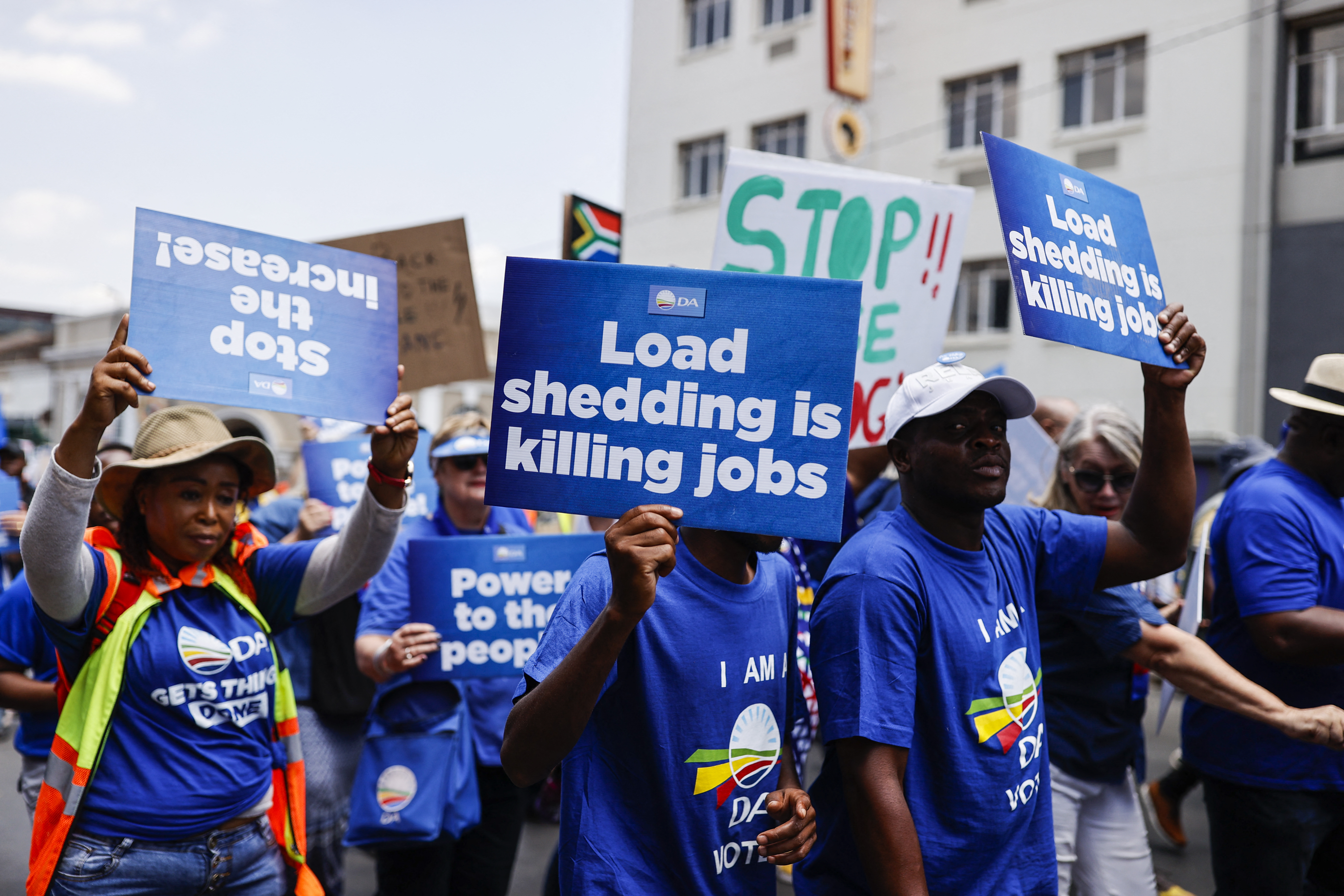 Some held signs reading, “Enough is enough,” “Power to the people” and “Load shedding is killing jobs.”