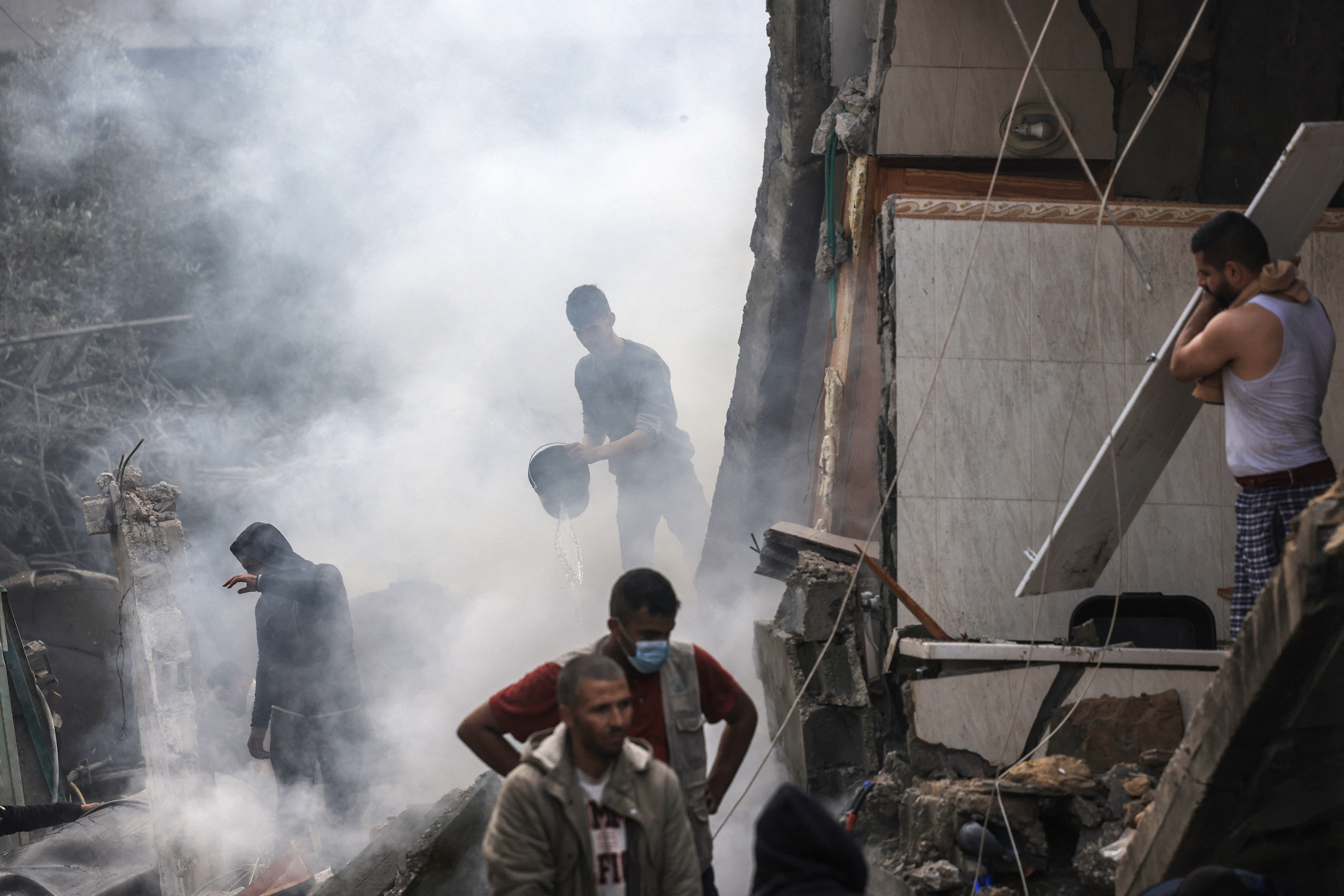 In the main southern city, Khan Younis, where advancing Israeli forces reached the centre this week, a whole city block was bombed to dust overnight. Although most people had fled after Israeli warnings, neighbours digging in the rubble with a hand shovel afterwards said they believed four people were under the debris. One body had been recovered.