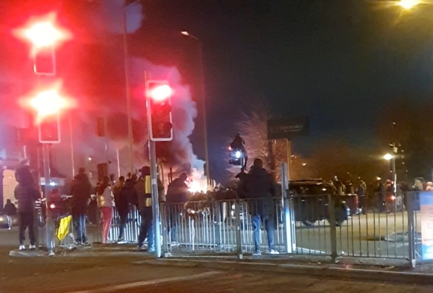 The police force said some protesters threw objects and set a police van on fire. The people arrested, who ranged in age from 13 to 54, were detained “following violent disorder.”
