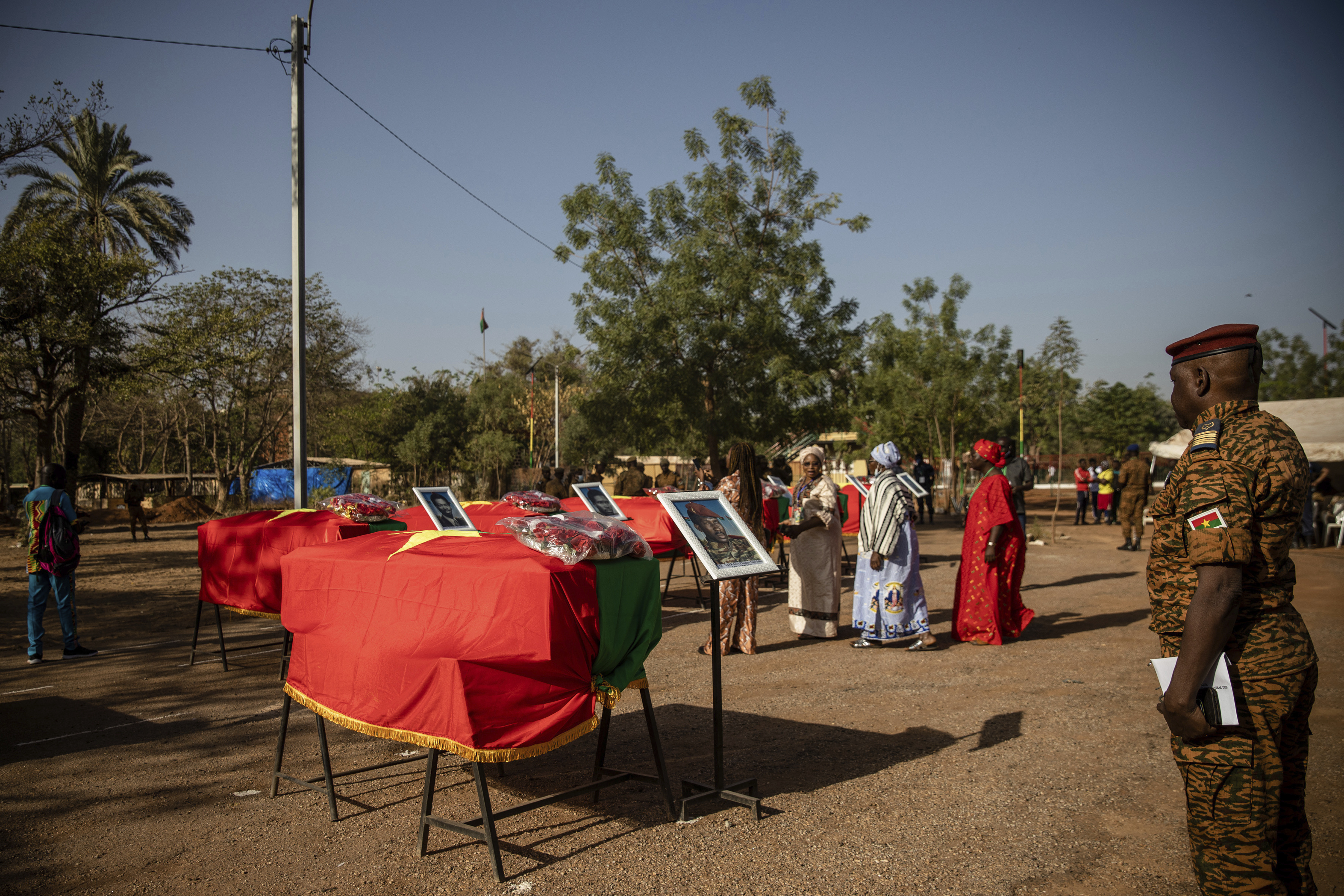 All the coffins were draped in Burkina Faso flags with a photo beside them.