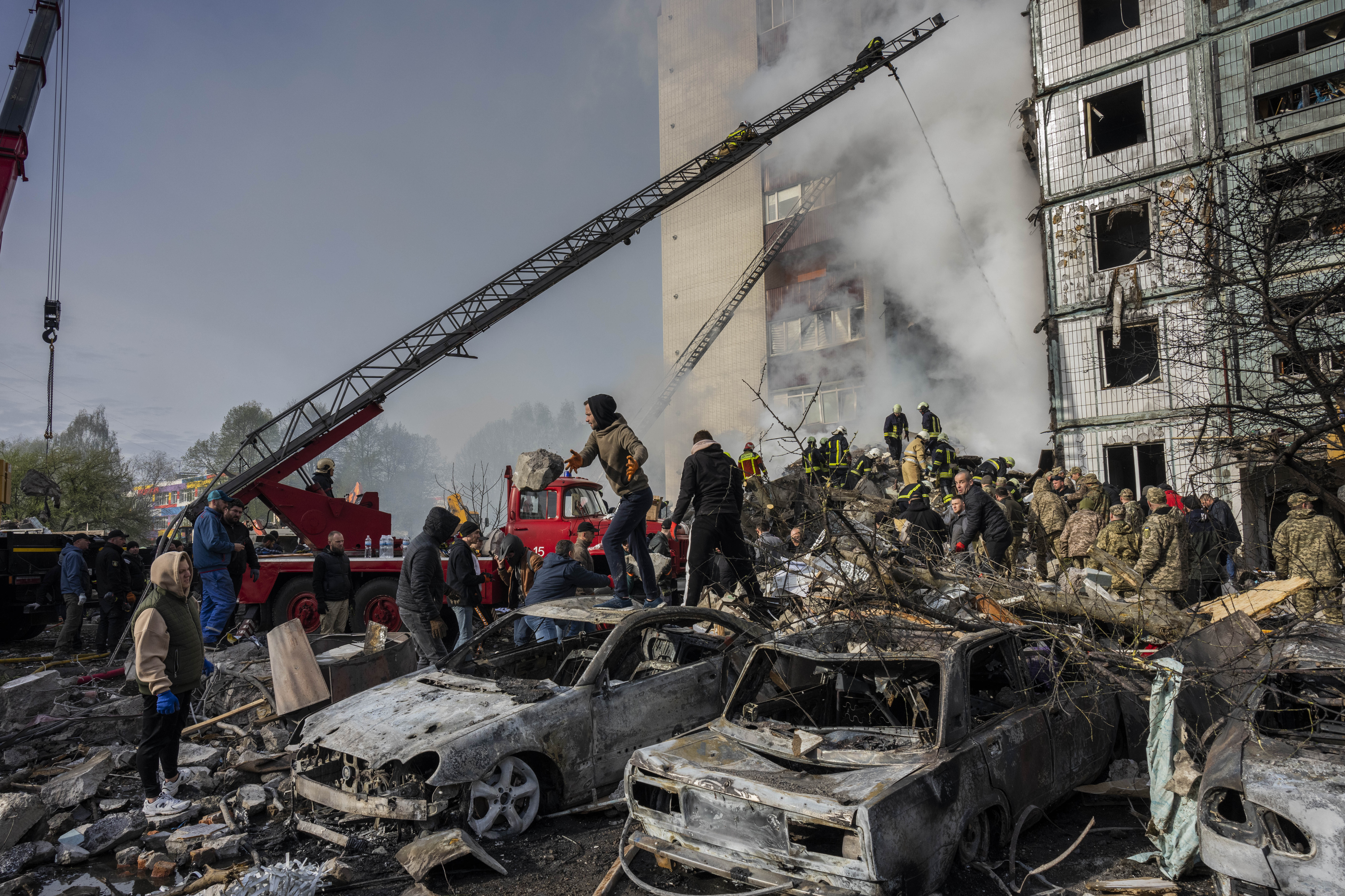 Firefighters tackled a blaze at a residential apartment hit by a Russian missile in the central town of Uman and rescue workers clambered through a huge pile of smouldering rubble, searching for survivors and bodies as anxious people stood by. Officials said at least 23 civilians were killed there, including four children.