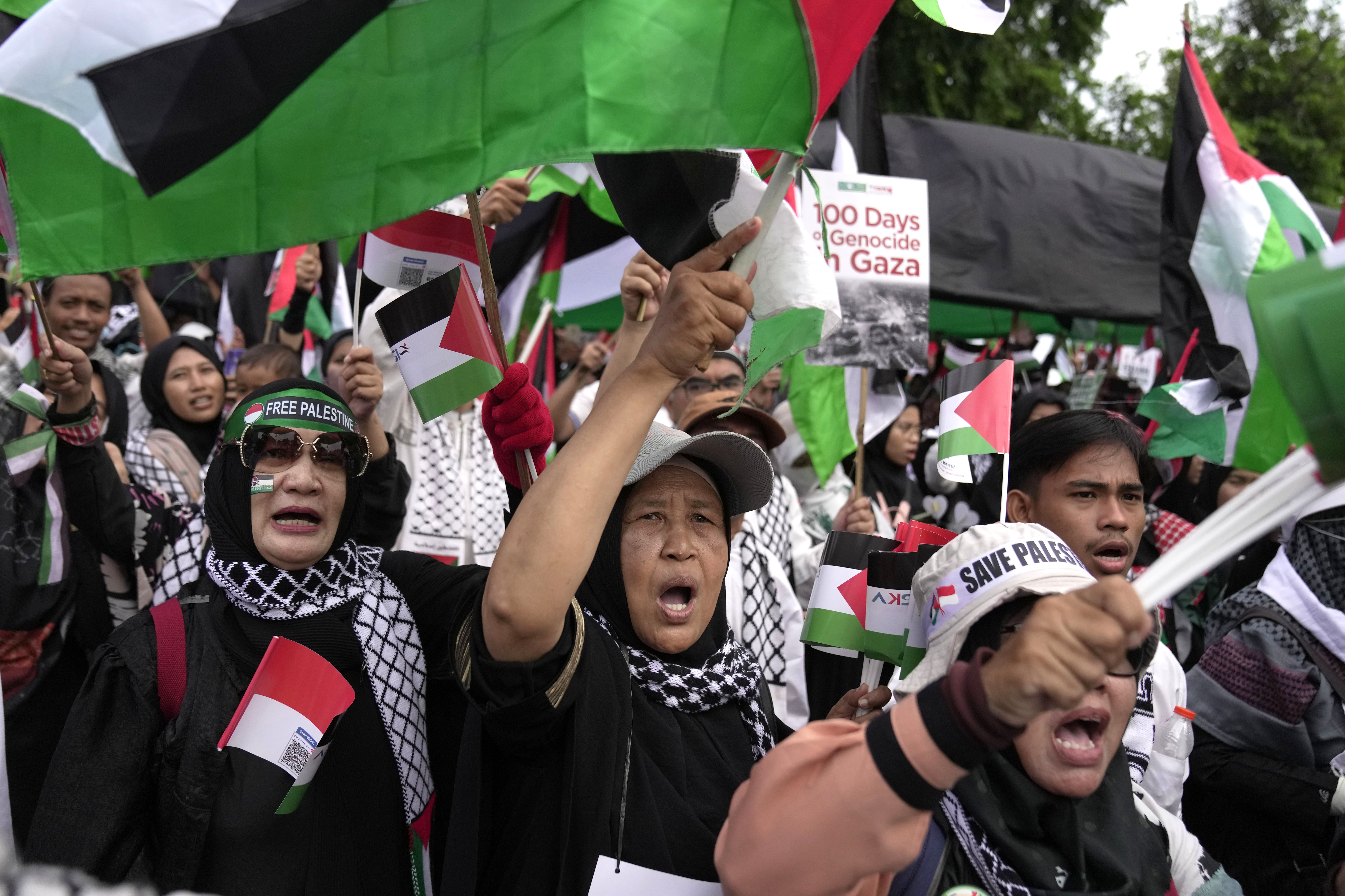 Thousands of people also gathered outside the US embassy in Indonesia’s capital, Jakarta, waving Indonesian and Palestinian flags and holding signs that read “Boycott Israel” and “Ceasefire Now.”