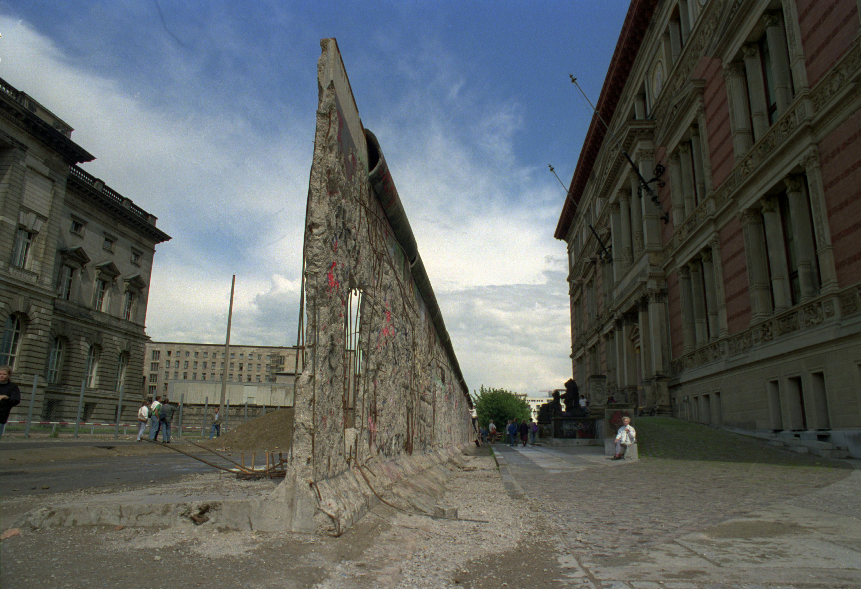 A broken remnant of the Berlin Wall, with steel reinforcing rods exposed, runs through the city's Niederkirchner Strasse in 1991, dividing the former East Germany (to the left of the wall) and West Germany (to the right) [File: Peter Winkler/AP]