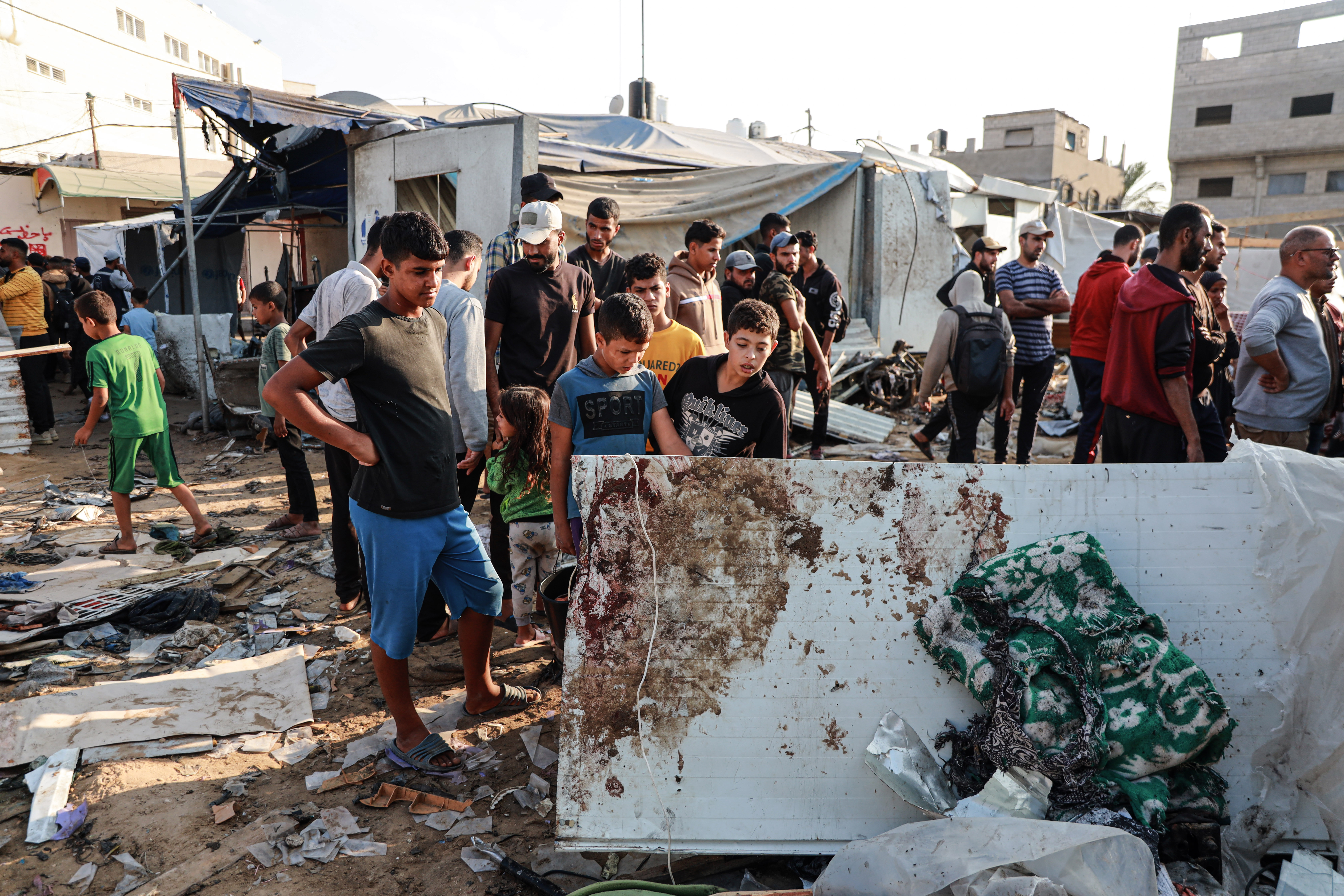 People survey the aftermath of an Israeli attack on tents near Gaza's Al-Aqsa Hospital on November 9, 2024 [Abedelhakim Abu Riash/Al Jazeera]