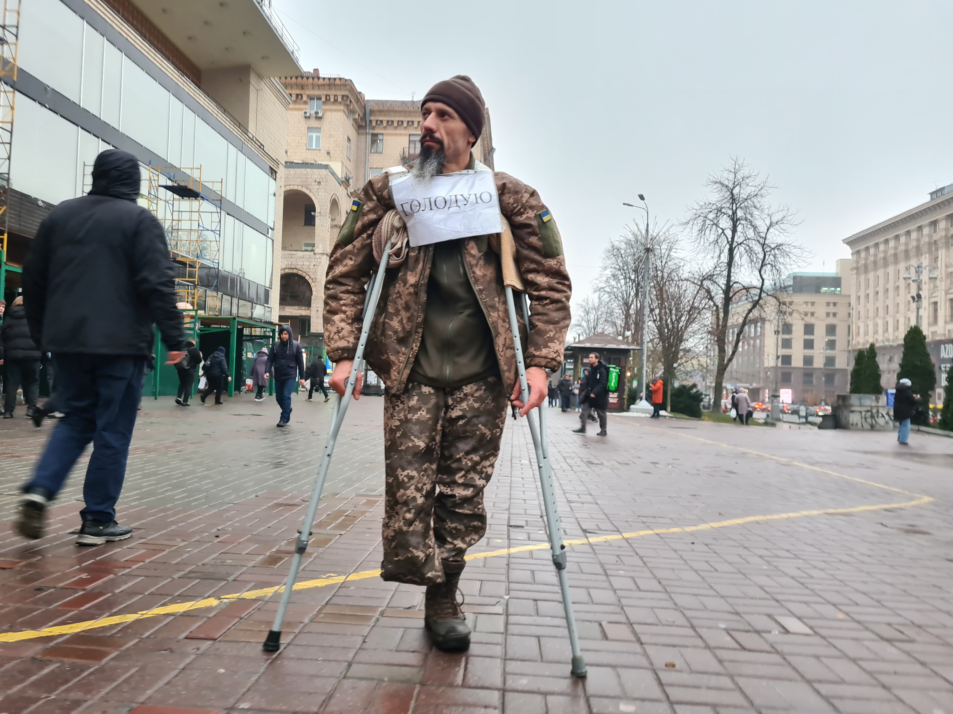 Now in the Ukrainian capital, passers-by flowed around him as he begged for money to survive.