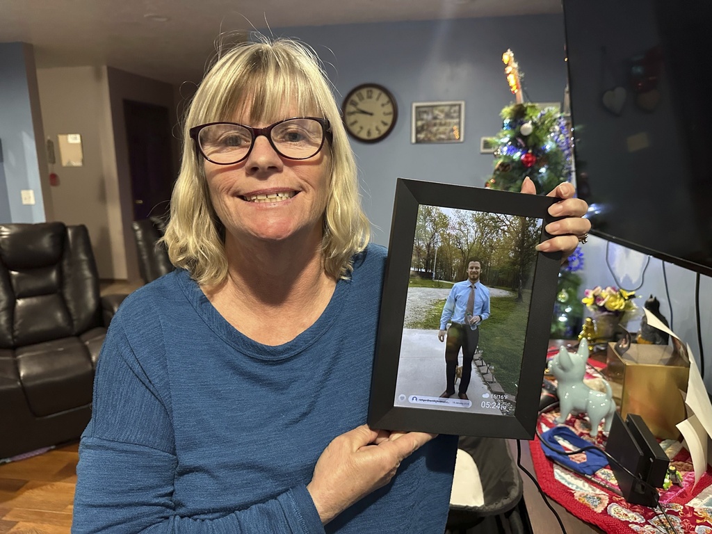 Stacey Collins Gardiner holds a picture of her son, Travis Timmerman, in her home in Urbana, Missouri, on December 12 [Nick Ingram/AP Photo]