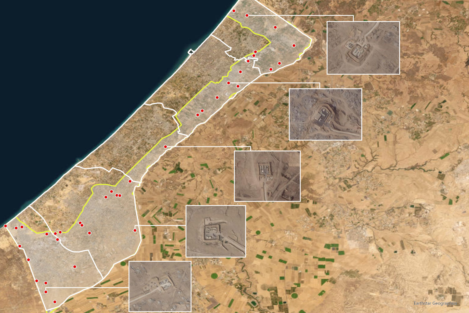 Satellite imagery shows Israel holds about 40 active military positions beyond the yellow line.