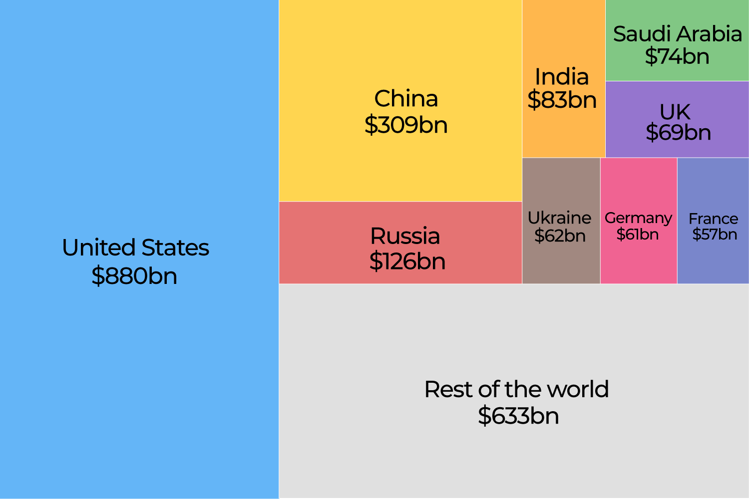 China is the second highest spender with $309bn, followed by Russia at $126bn, India at $83bn and Saudi Arabia at $74bn.