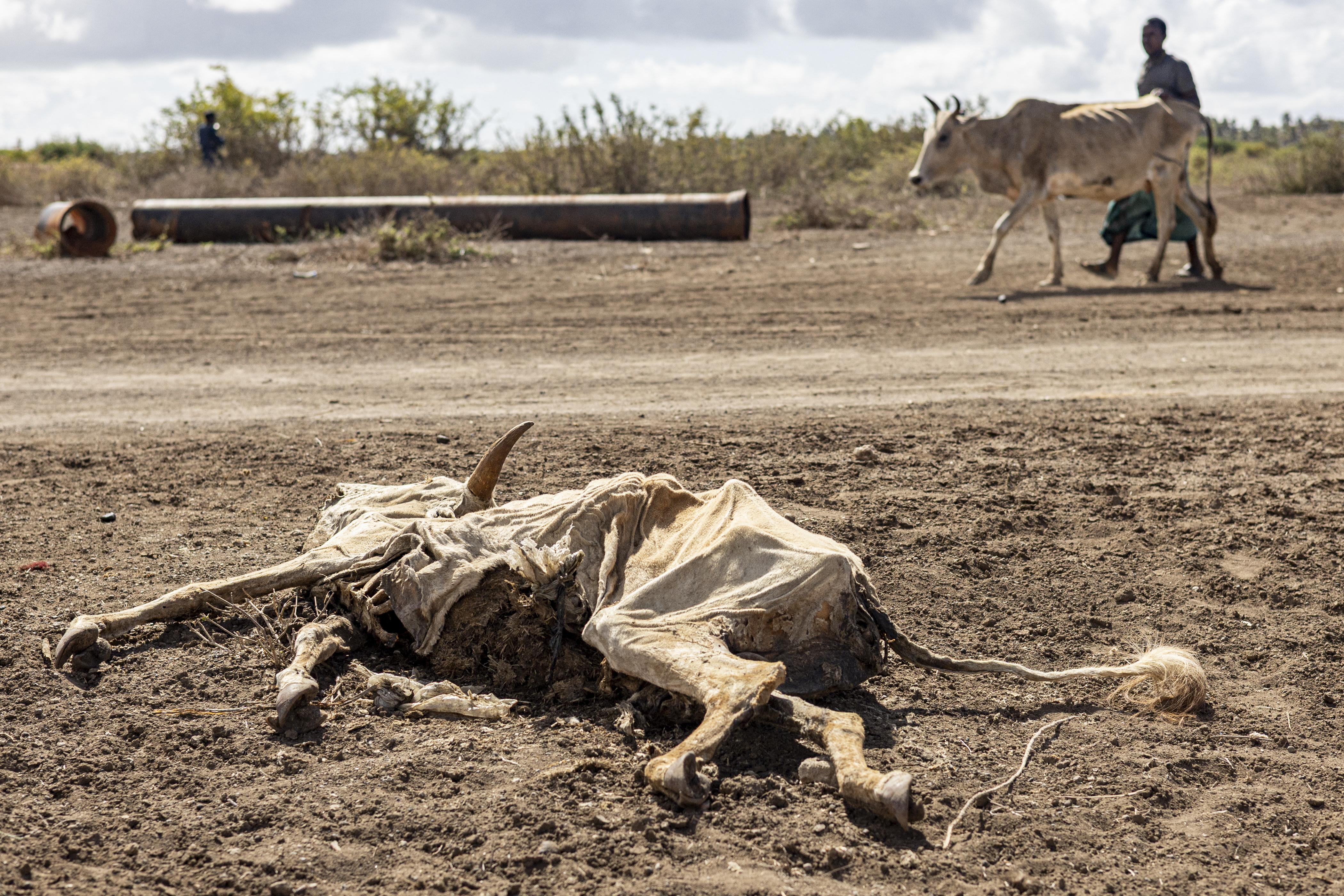 On the outskirts of Somalia’s southern port city, the land has become an open graveyard for cattle. Some are left where they fell, while others are buried in shallow graves after consecutive failed rainy seasons.