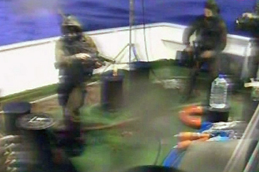 Footage from the flotilla’s lead vessel, the Mavi Marmara, showed armed Israeli soldiers boarding the ship and helicopters flying overhead.