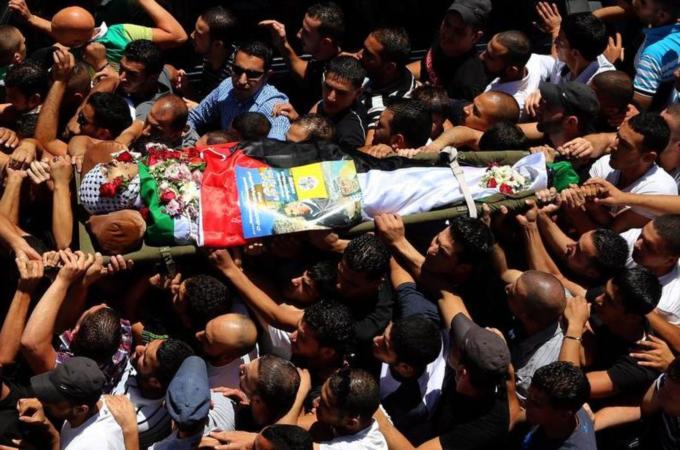 Amid angry chants and a sea of Palestinians and Palestinian flags, the body of Araj was whisked through the streets of Qalandia on Friday to its final resting place in the camp’s cemetery.