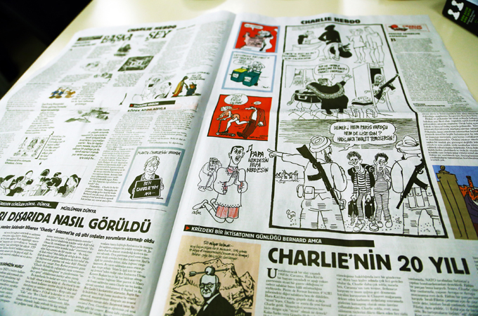 Secularist Cumhuriyet newspaper published four pages of translated Charlie Hebdo cartoons on Wednesday, the same day the latest edition of Charlie Hebdo came out.