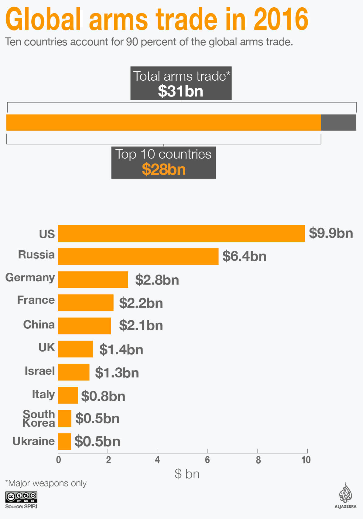 The growingdemandfor conventional weapons is making many providers very wealthy. The top 100 arms companies have sold over$5 trillion worth of merchandise since 2002. In 2016, some$31bn was generated by the international arms trade, the US earning $9.9bn of it, followed by Russia with $6.4bn and Germany with $2.8bn.