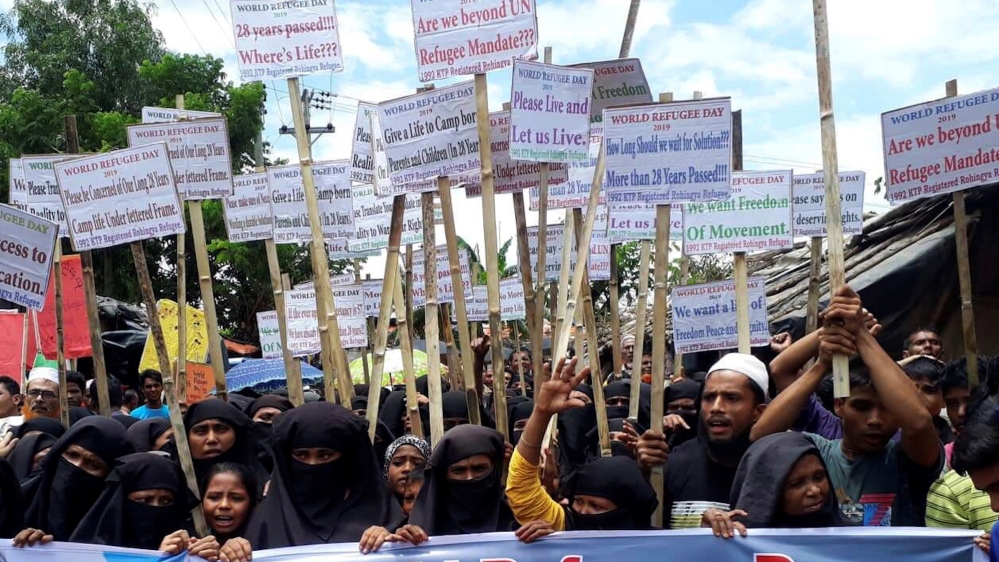 Rohingya refugees hold placards as they participate in a rally to observe World Refugee Day at the Rohingya refugee camp in Cox's Bazar, Bangladesh on June 20, 2019 [File: Rafiqur Rahman/Reuters]