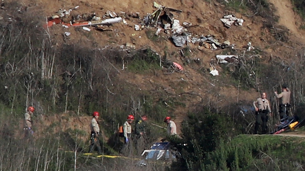 Coroner’s officials worked to recover victims’ remains from the hillside outside Los Angeles where the helicopter crashed. Aviation experts say the accident might have been caused by the pilot becoming disoriented in the fog.