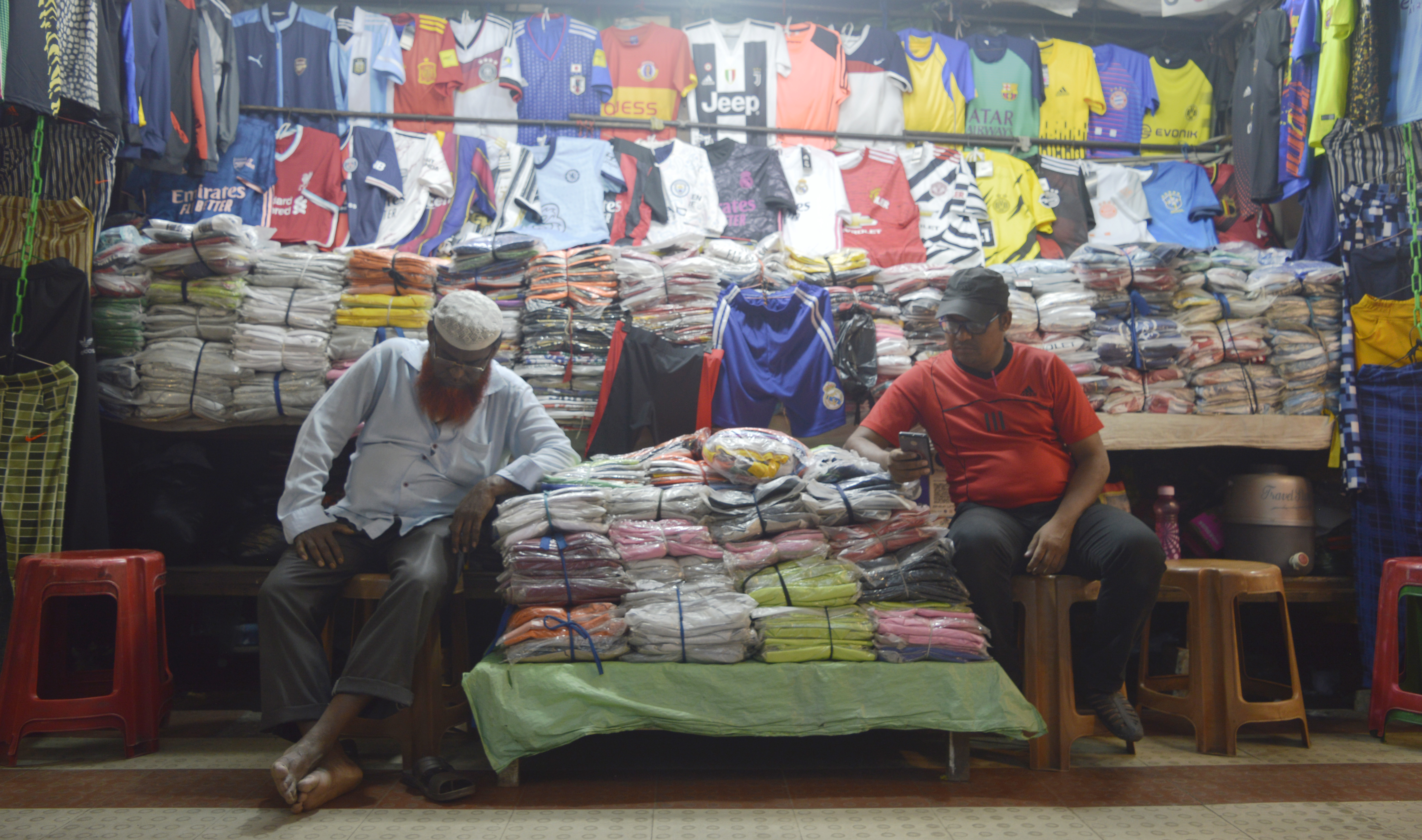 Mohammed Nadim, who has been working at the stall for more than 23 years, pulls out a plastic stool from underneath a rack stashed with low-priced football jerseys and begins examining the consignment.