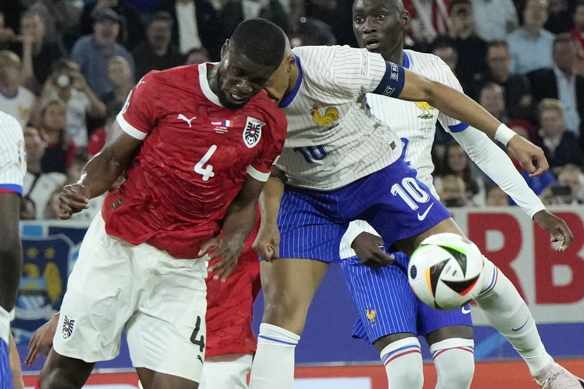 An inadvertent collision with Austria’s Kevin Danso caused France’s superstar Kylian Mbappe to suffer a broken nose.